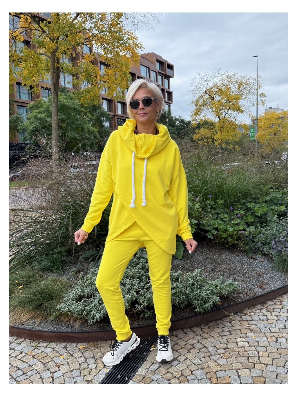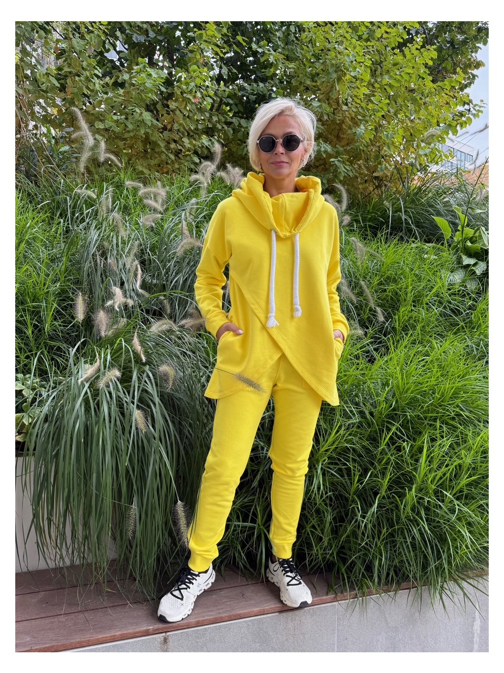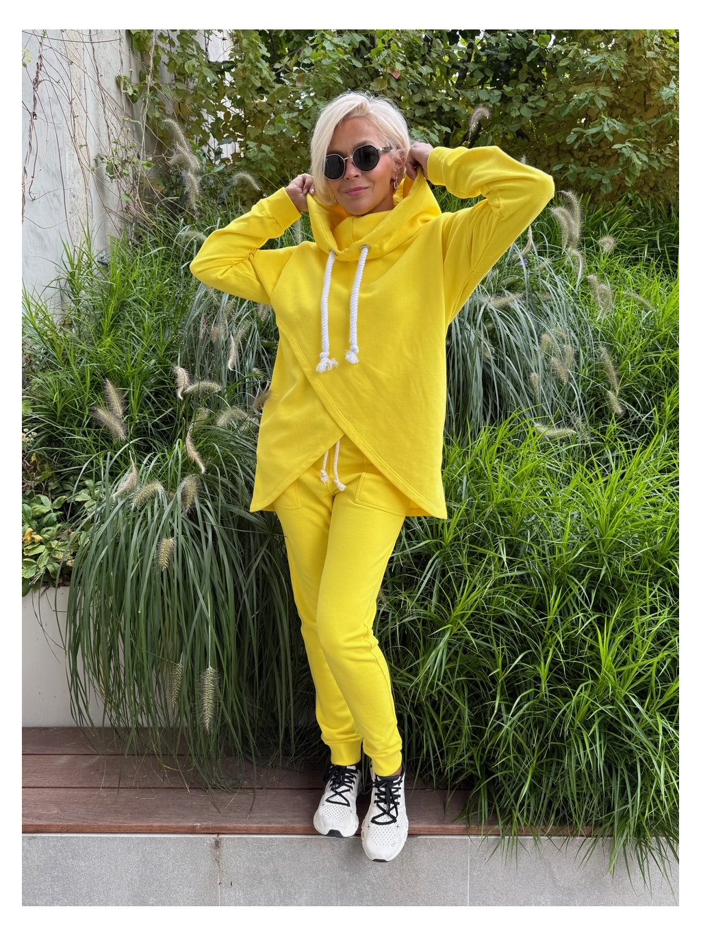 Žlutá tepláková souprava s kapucí, bílými šňůrami a originálním překříženým střihem.