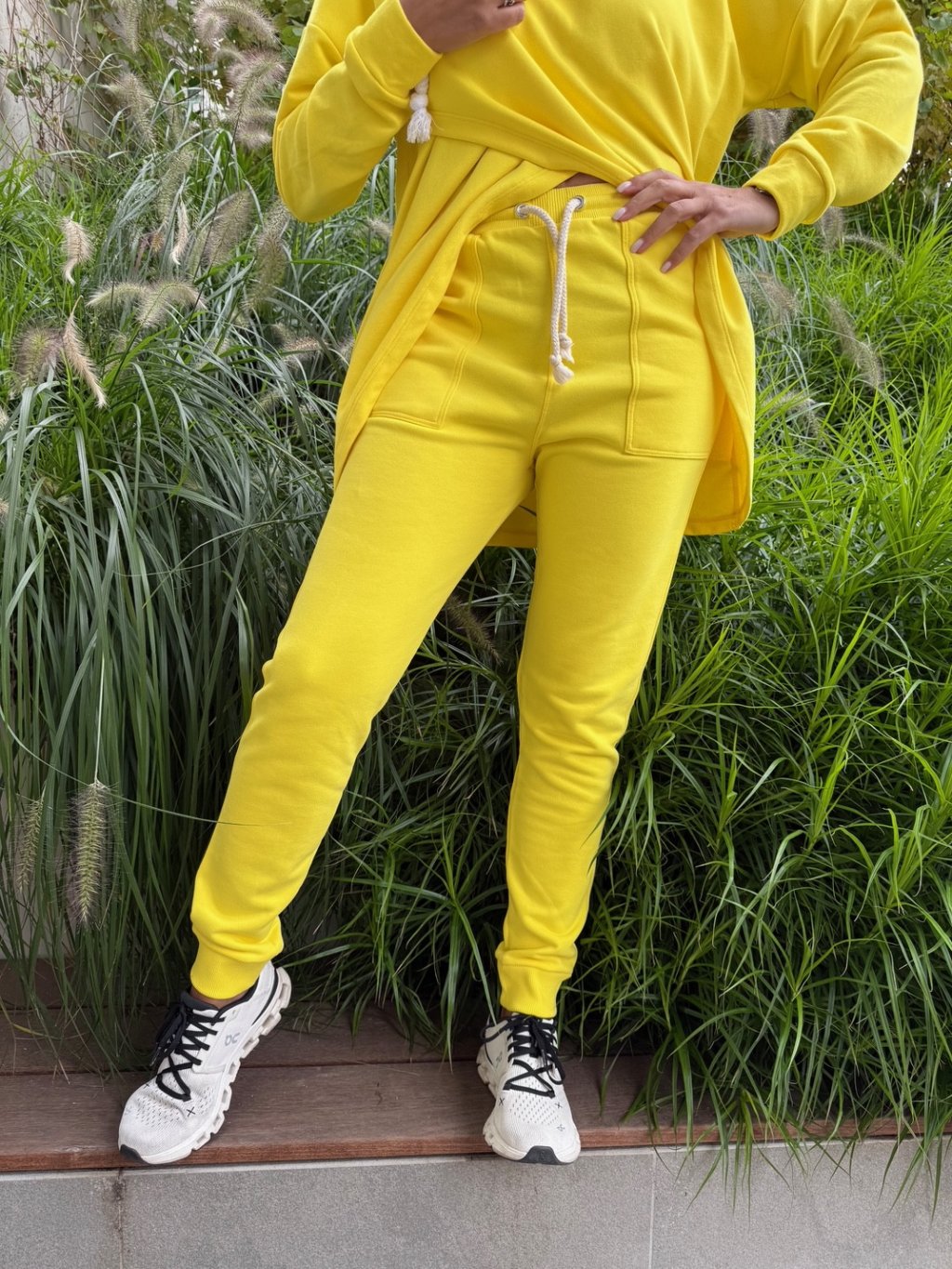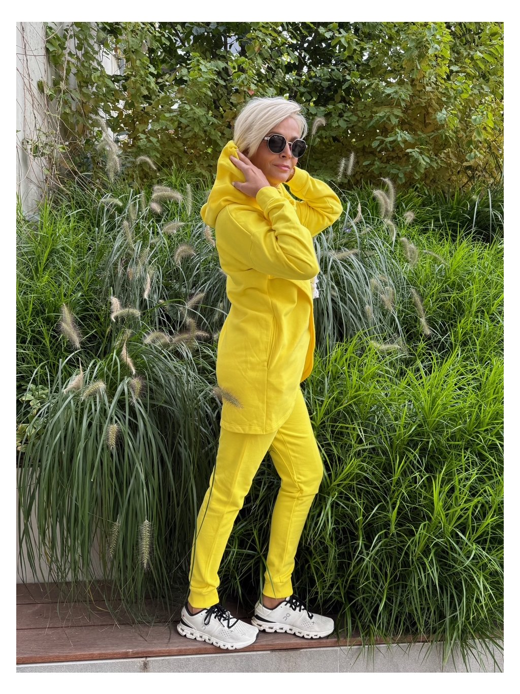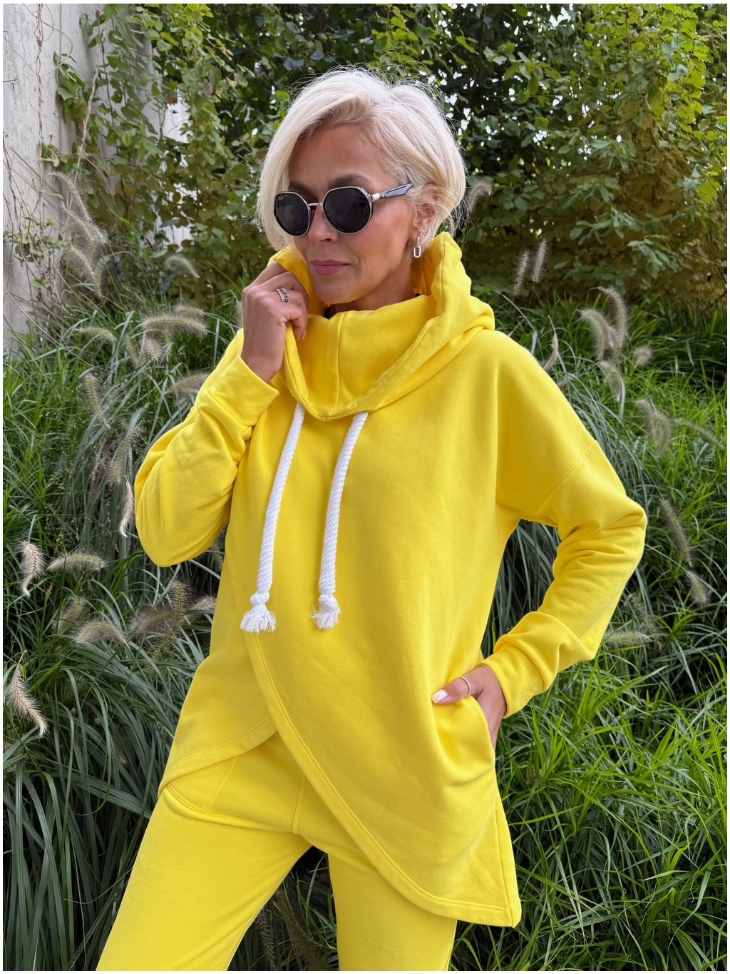 Žlutá tepláková souprava s kapucí, bílými šňůrami a originálním překříženým střihem.