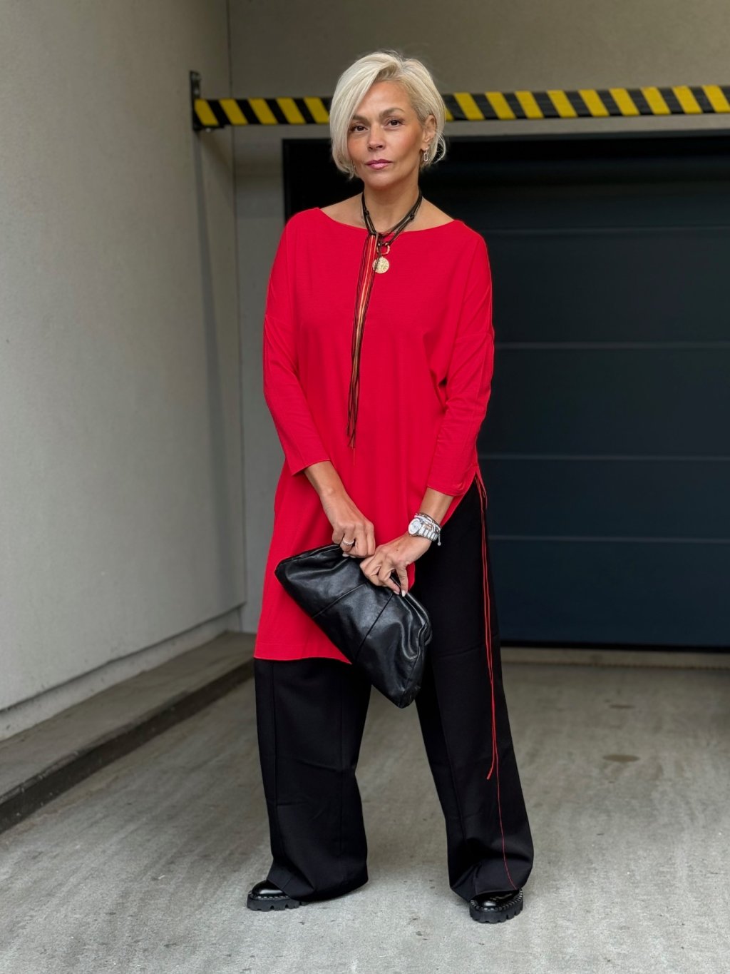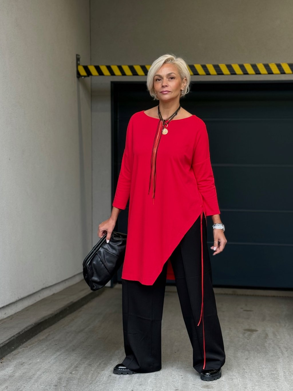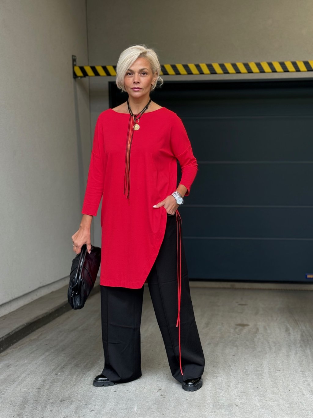 Asymetrická viskózová halenka v krásné červené barvě a ozdobnou šňůrkou.