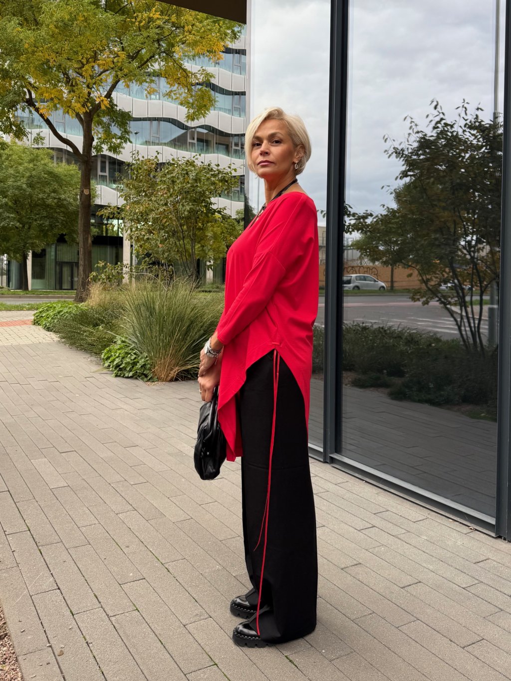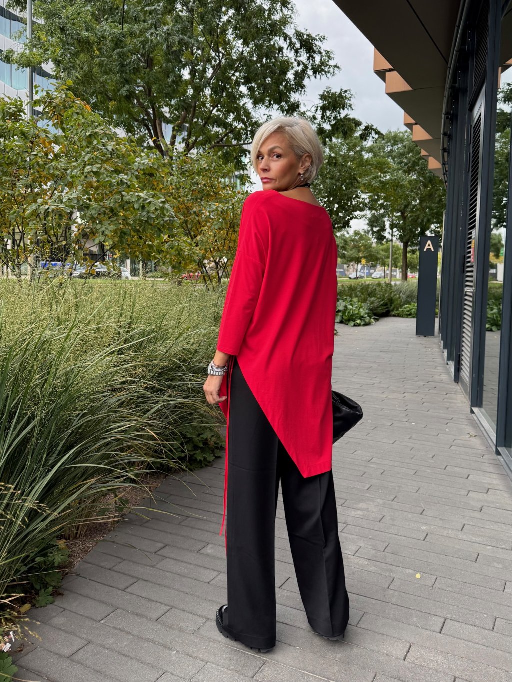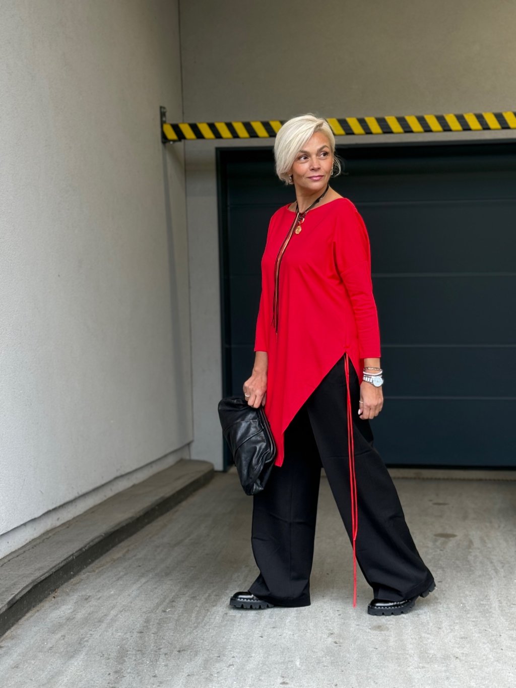 Asymetrická viskózová halenka v krásné červené barvě a ozdobnou šňůrkou.