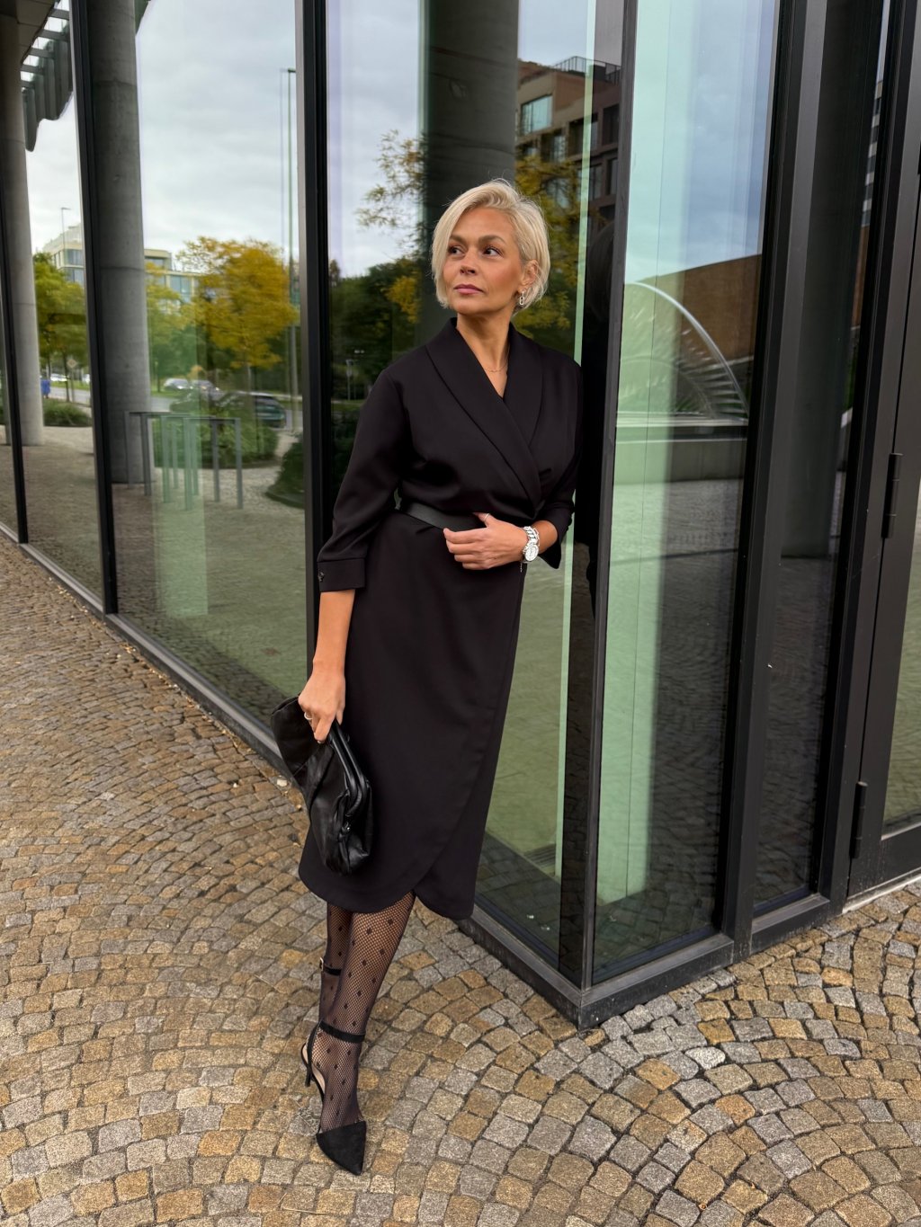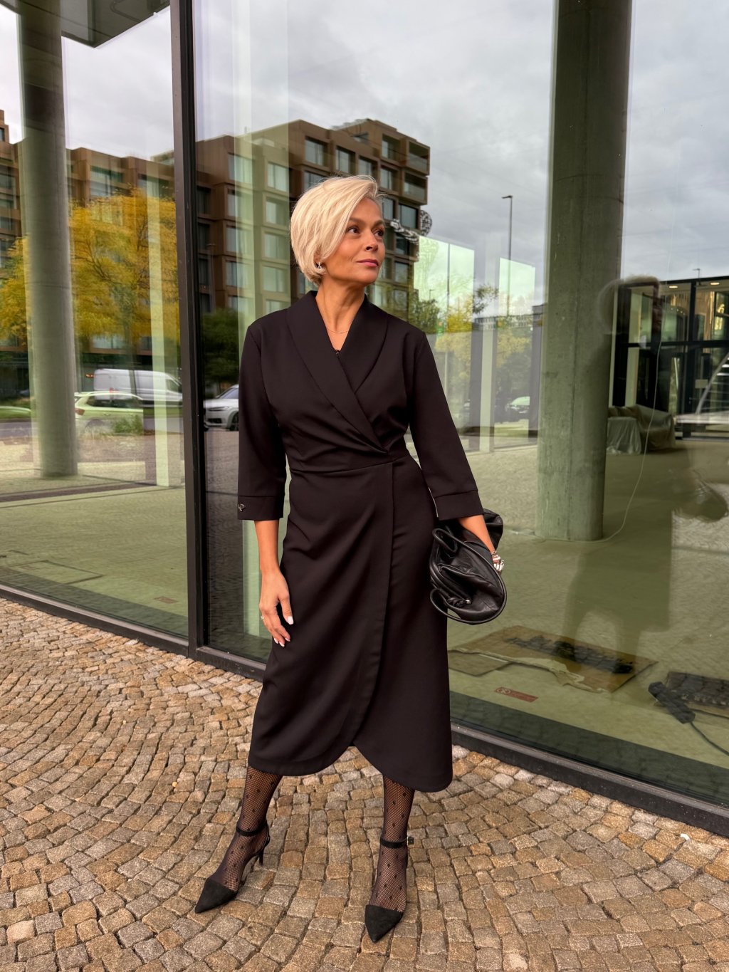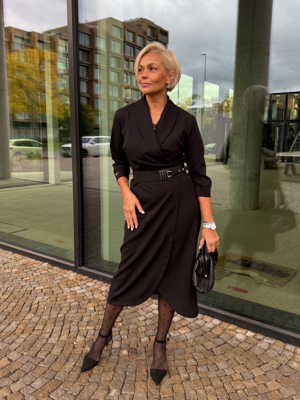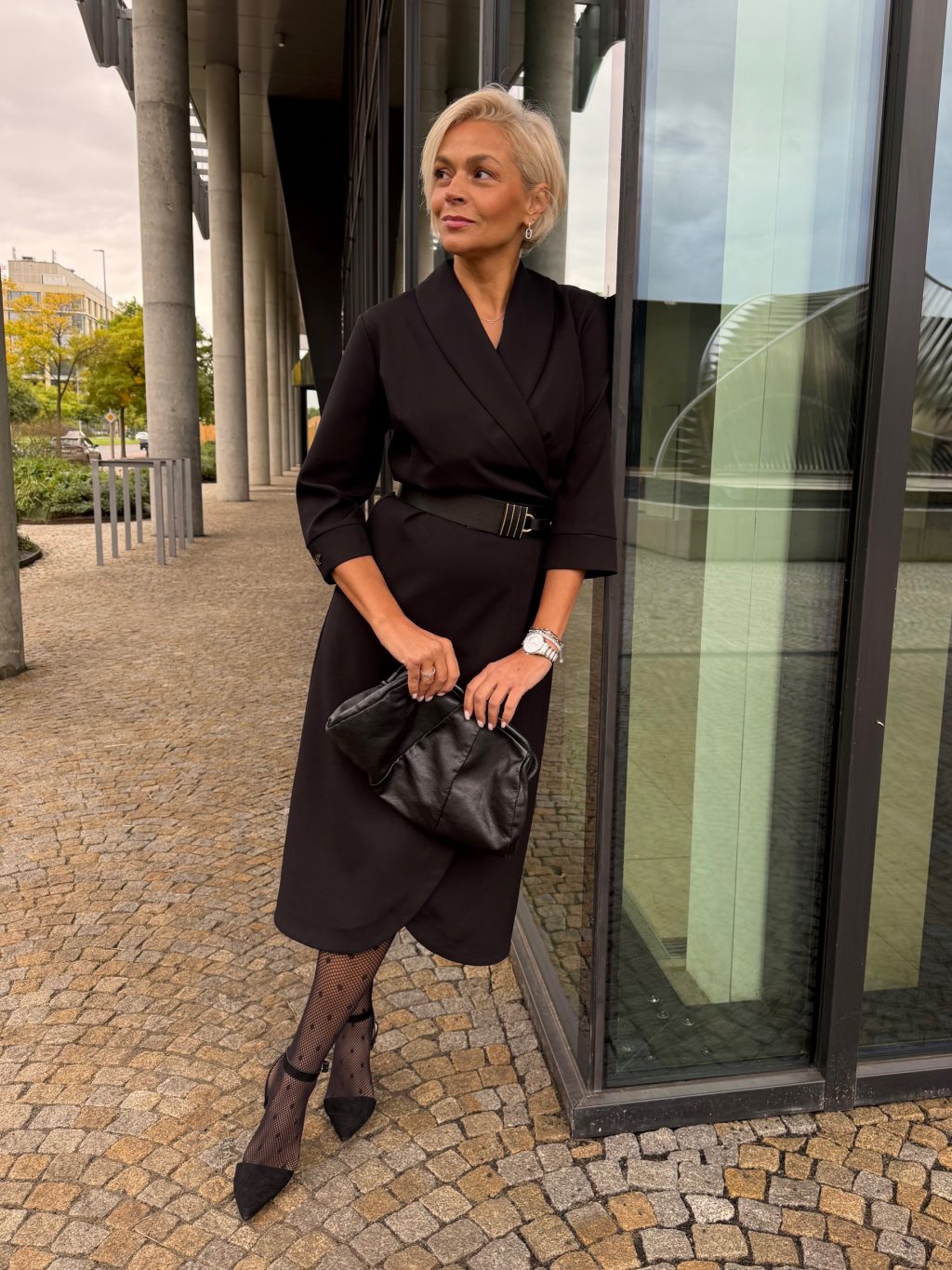 Tyto černé šaty s přepásáním v pase vyzařují nadčasovou eleganci a sebevědomí. Díky jednoduchému střihu a precizním detailům působí dokonale sofistikovaně pro každou příležitost.K šatům dostanete pásek zadarmo.Z boku mají skrytý zdrhovadlo pro snadnější oblékání.