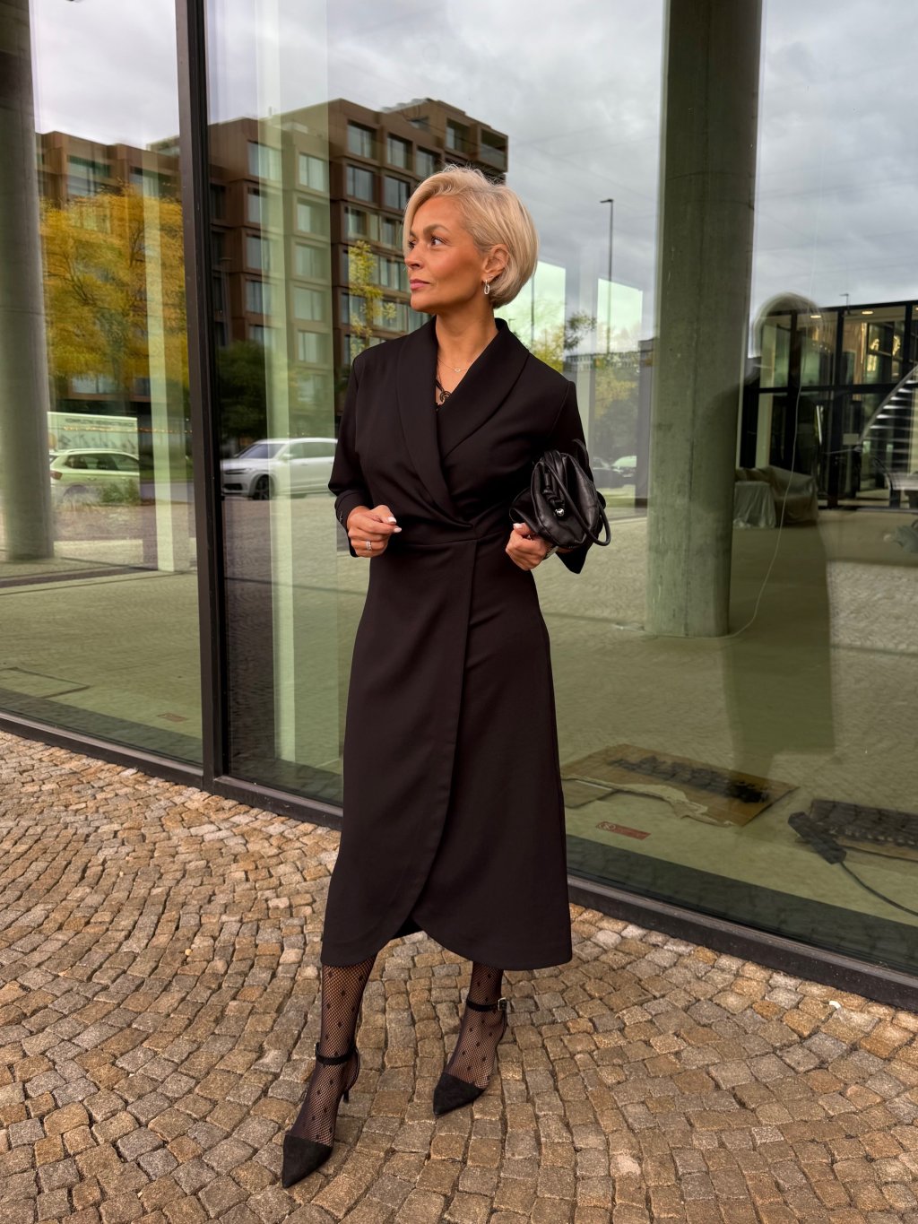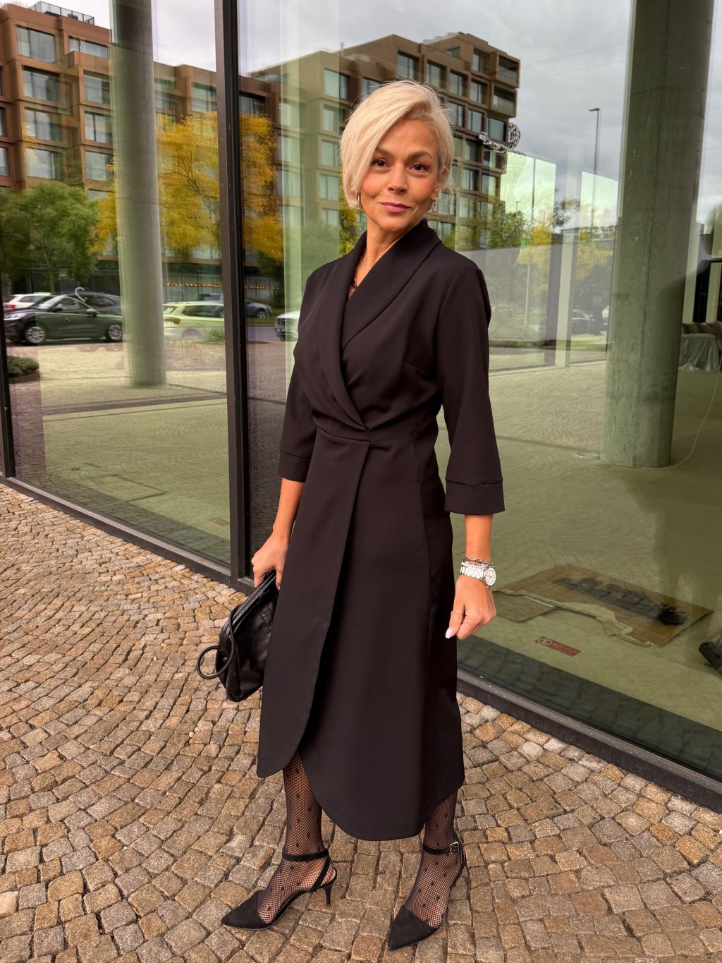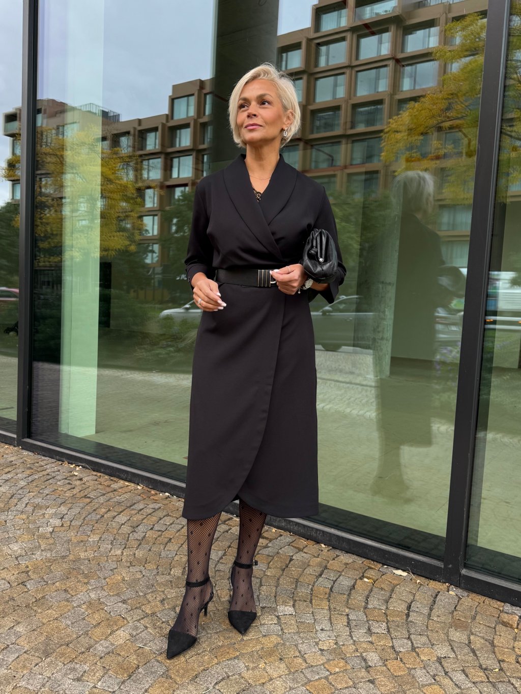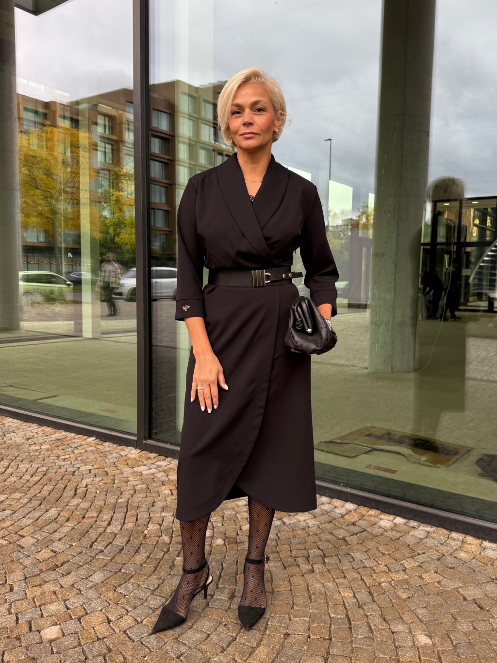 Tyto černé šaty s přepásáním v pase vyzařují nadčasovou eleganci a sebevědomí. Díky jednoduchému střihu a precizním detailům působí dokonale sofistikovaně pro každou příležitost.K šatům dostanete pásek zadarmo.Z boku mají skrytý zdrhovadlo pro snadnější oblékání.