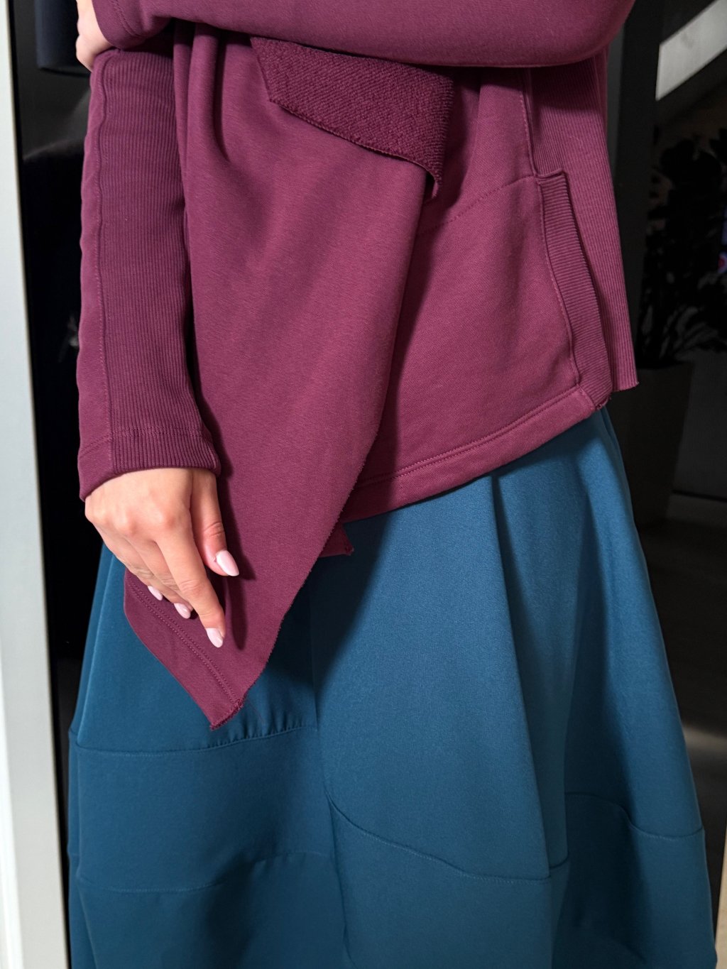 Minimalistická, balonová sukně se zadním zipem a kapsami, která lichotí každé postavě. Střih jsme propracovali do nejmenšího detailu, přední i zadní díl je oproti klasice vizuálně stejně dlouhý, a tak sukně získala nový look.