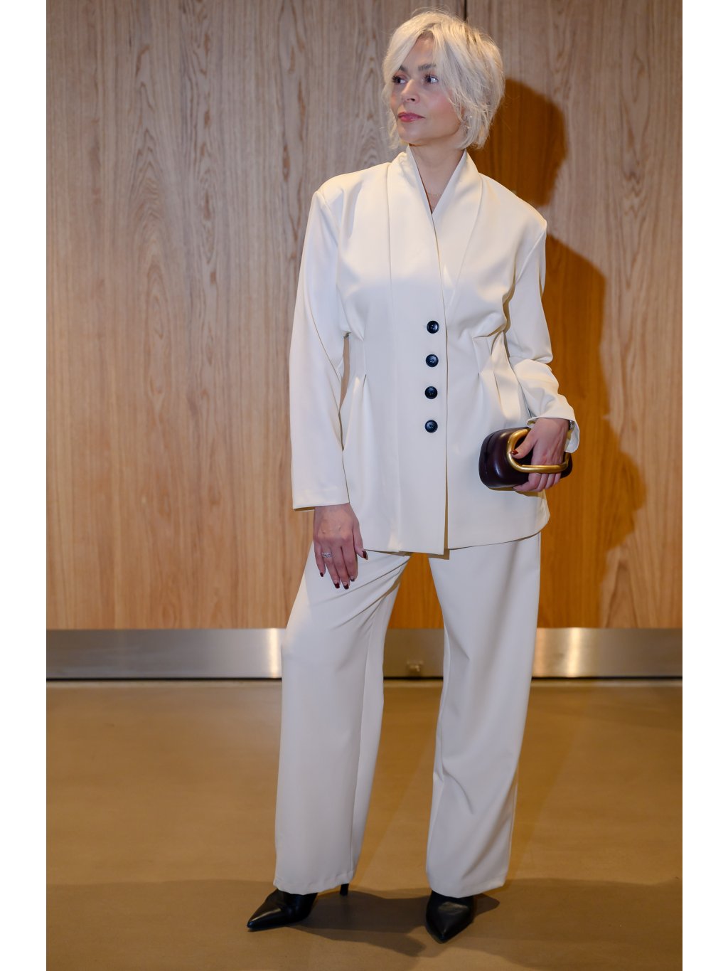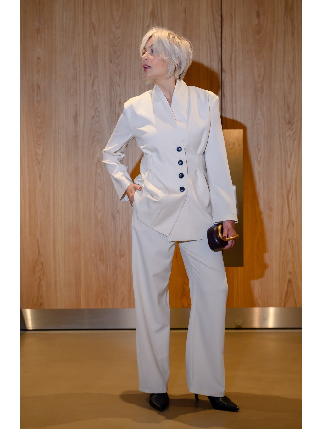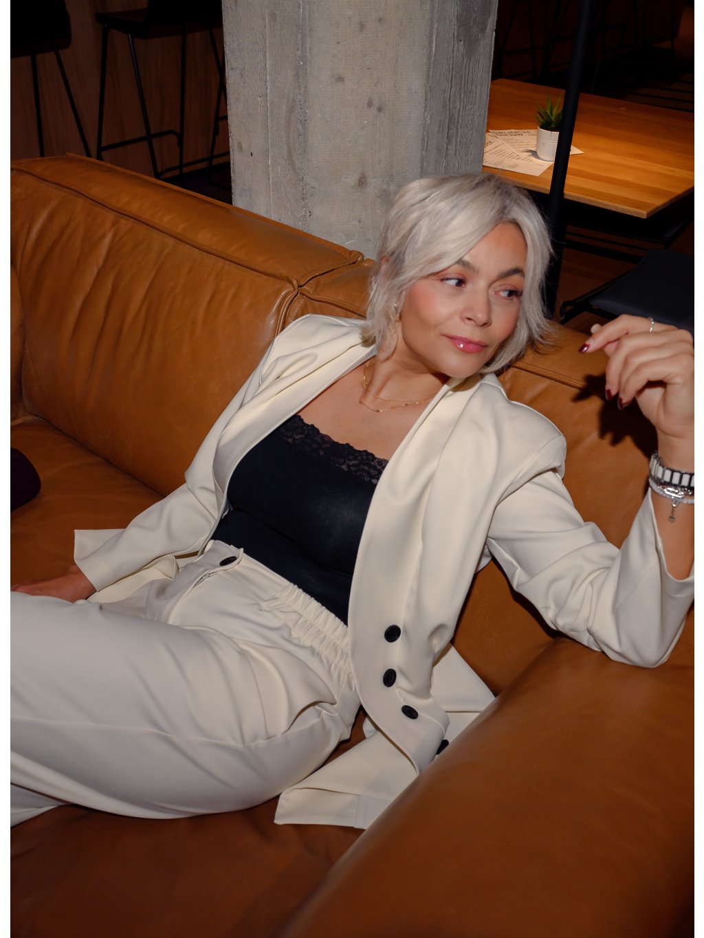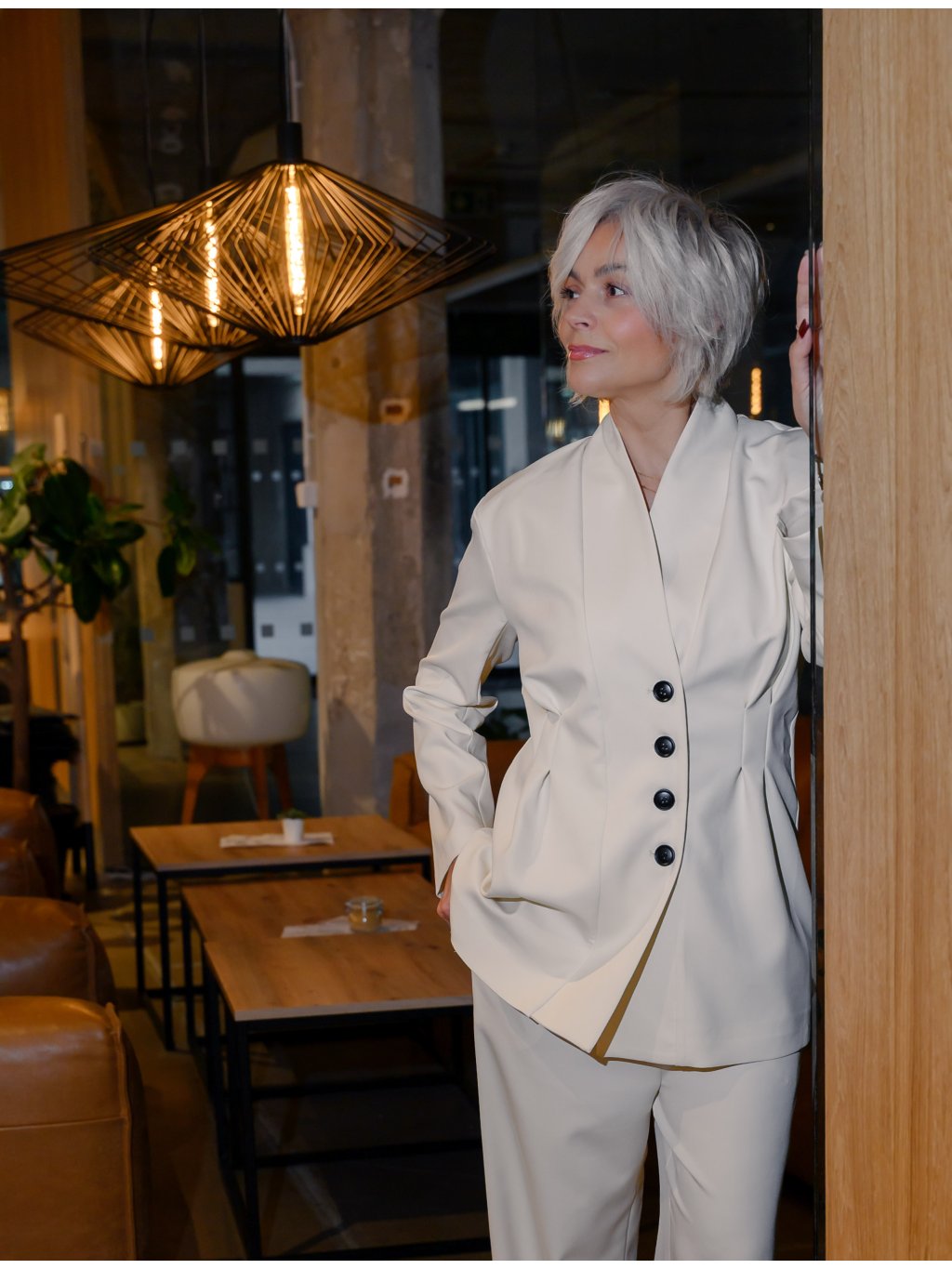 Sako má jemné vycpávky na ramenou, které krásně tvarují siluetu, a lehké projmutí v pase pro ženský a upravený vzhled. Kalhoty jsou navržené s pohodlnou gumou v pase, díky které perfektně sedí a zajišťují maximální komfort po celý den.