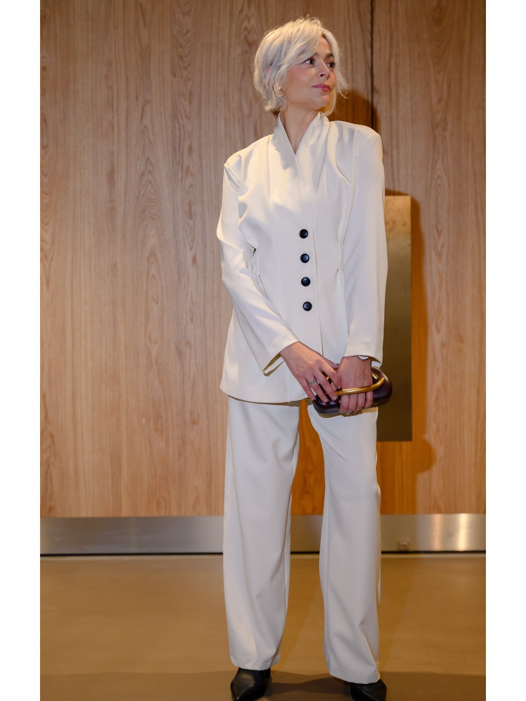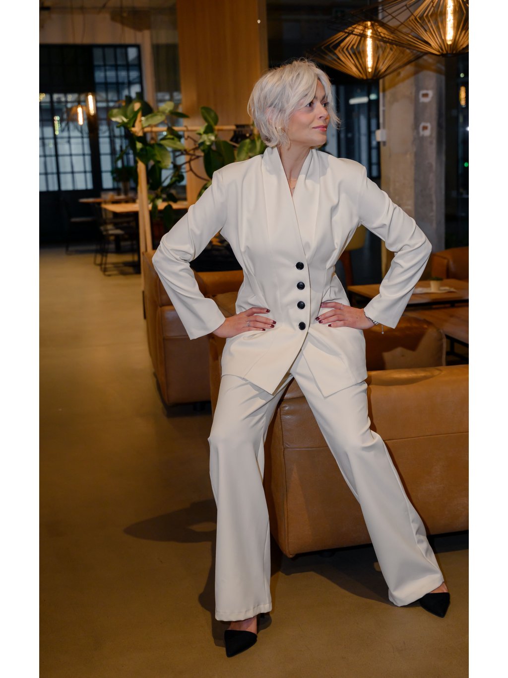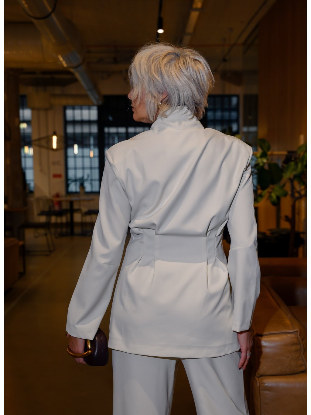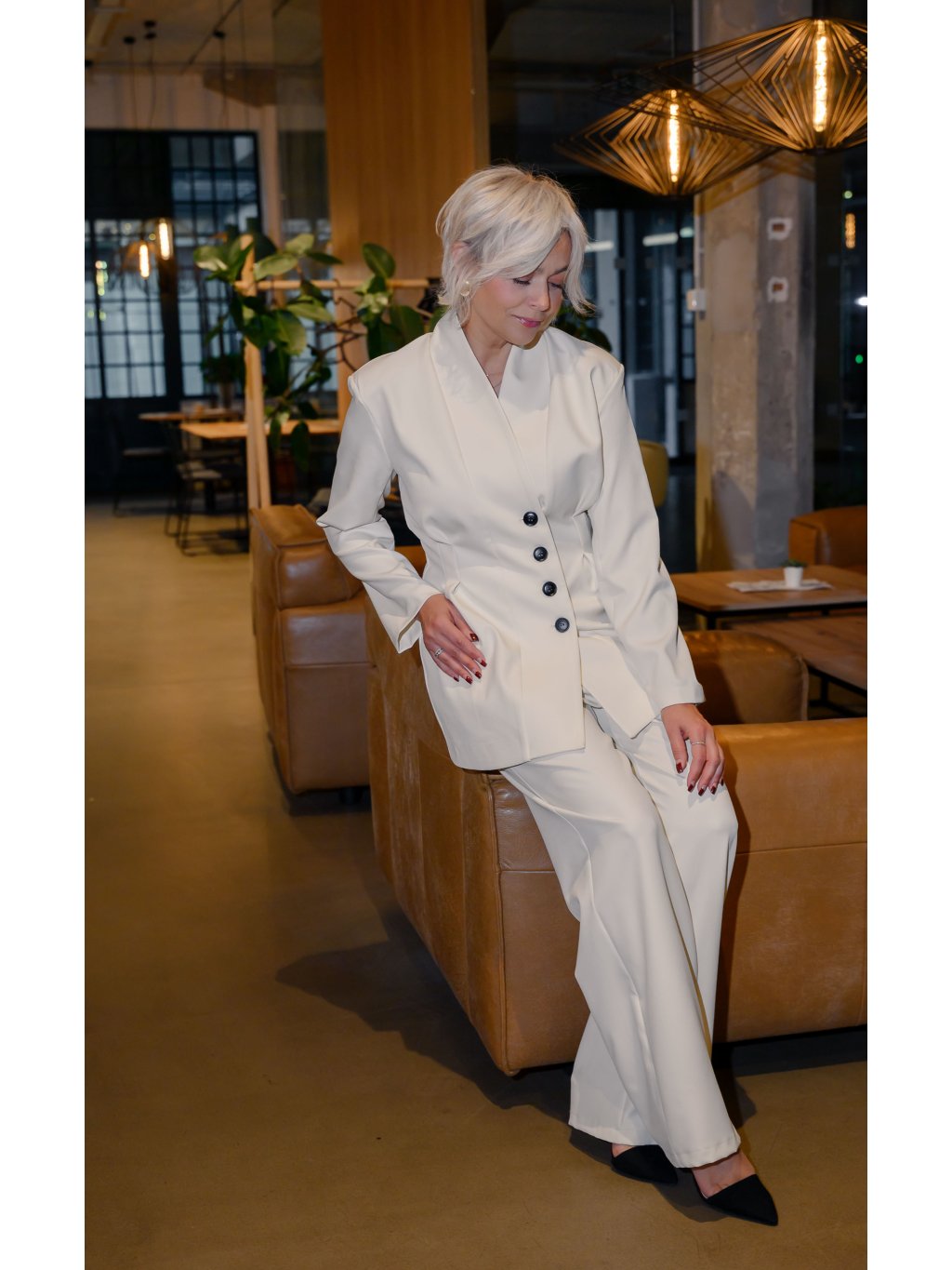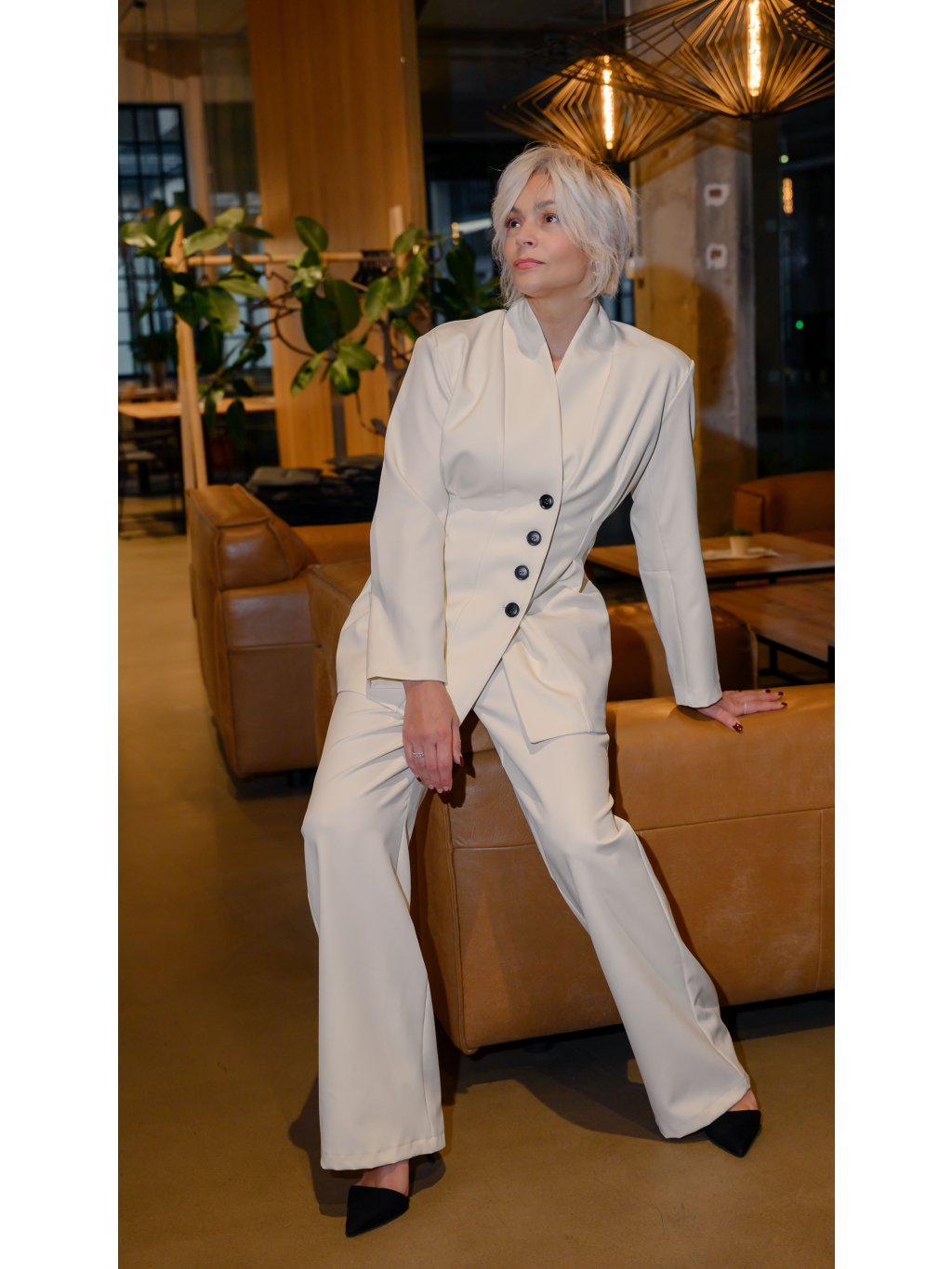 Sako má jemné vycpávky na ramenou, které krásně tvarují siluetu, a lehké projmutí v pase pro ženský a upravený vzhled. Kalhoty jsou navržené s pohodlnou gumou v pase, díky které perfektně sedí a zajišťují maximální komfort po celý den.