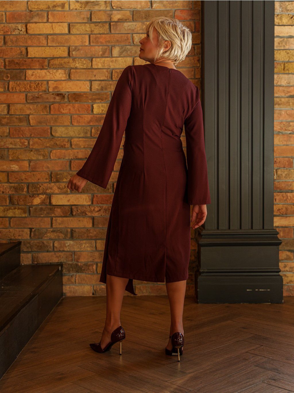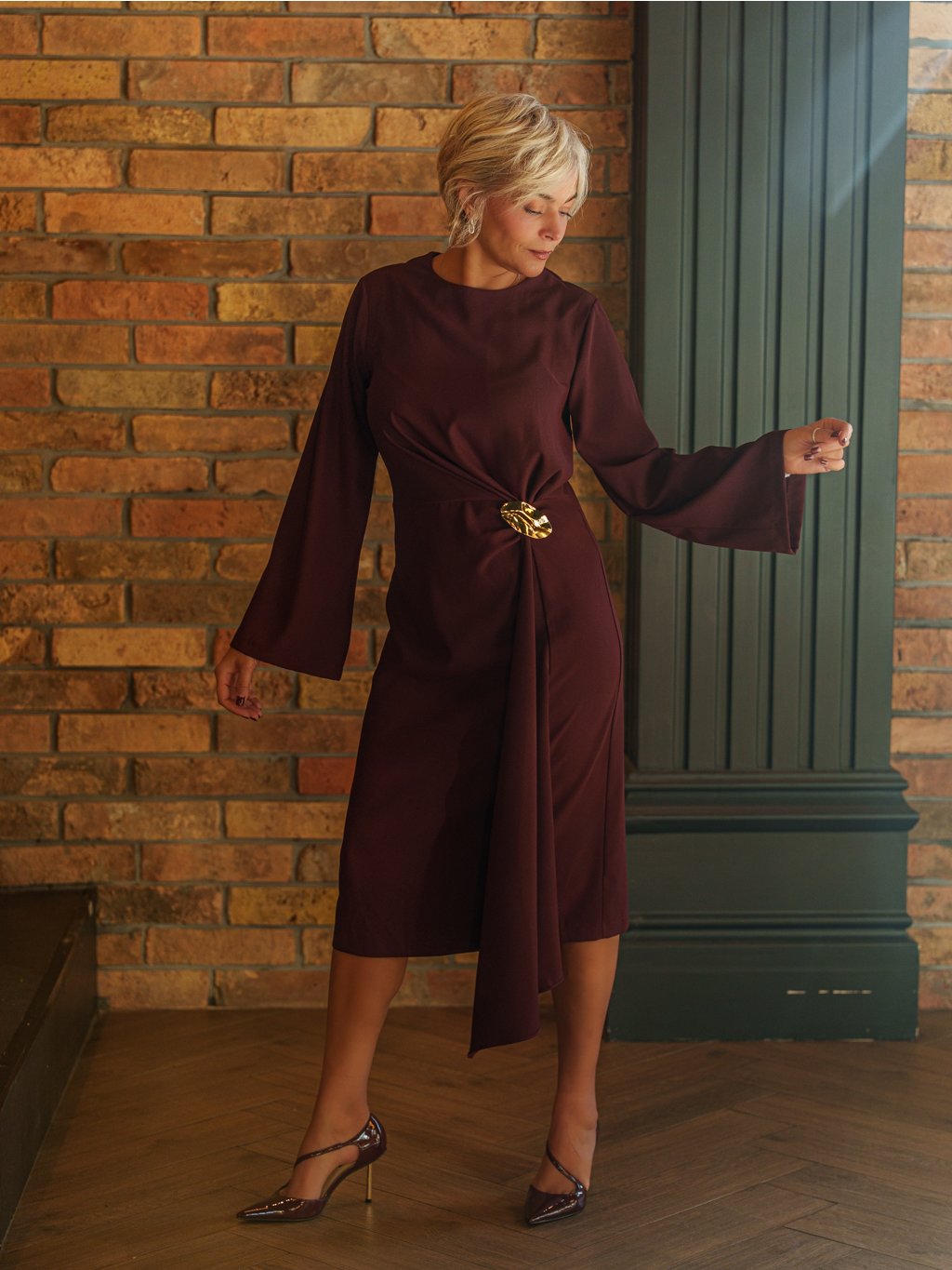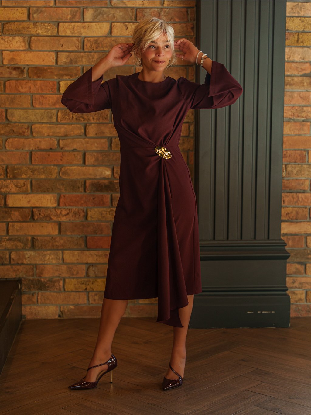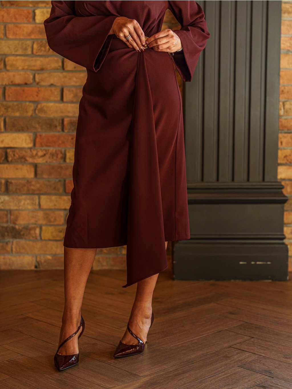 Elegantní šaty okouzlí svou elegantní jednoduchostí a promyšleným střihem, který lichotí ženské postavě. Jemně rozšířené rukávy a ozdobné řasení v pase s výraznou sponou dodávají modelu sofistikovaný a ženský charakter. Bohatá vínová barva podtrhuje nadčasovost těchto šatů, které se skvěle hodí jak pro společenské příležitosti, tak pro večerní události.