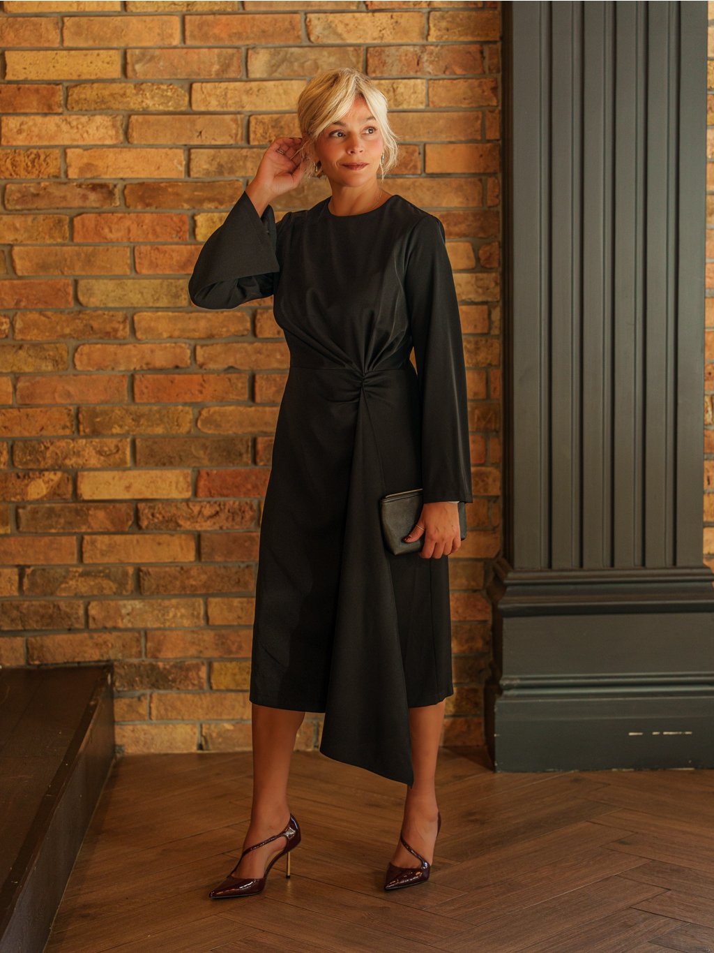 Elegantní šaty okouzlí svou elegantní jednoduchostí a promyšleným střihem, který lichotí ženské postavě. Jemně rozšířené rukávy a ozdobné řasení v pase s výraznou sponou dodávají modelu sofistikovaný a ženský charakter. Černá barva podtrhuje nadčasovost těchto šatů, které se skvěle hodí jak pro společenské příležitosti, tak pro večerní události.