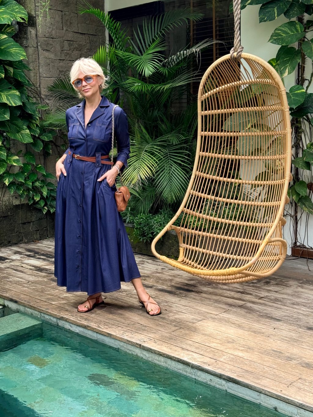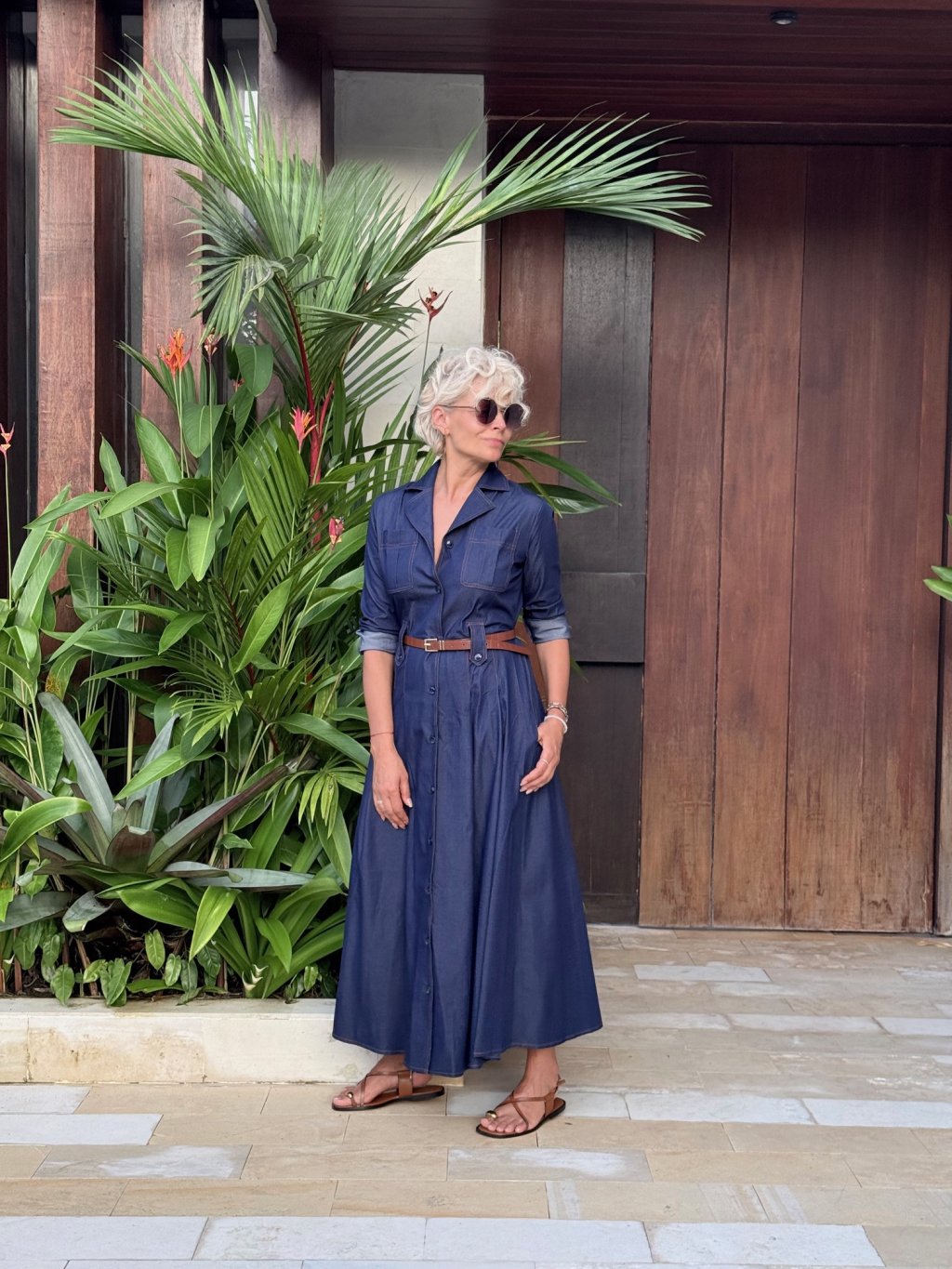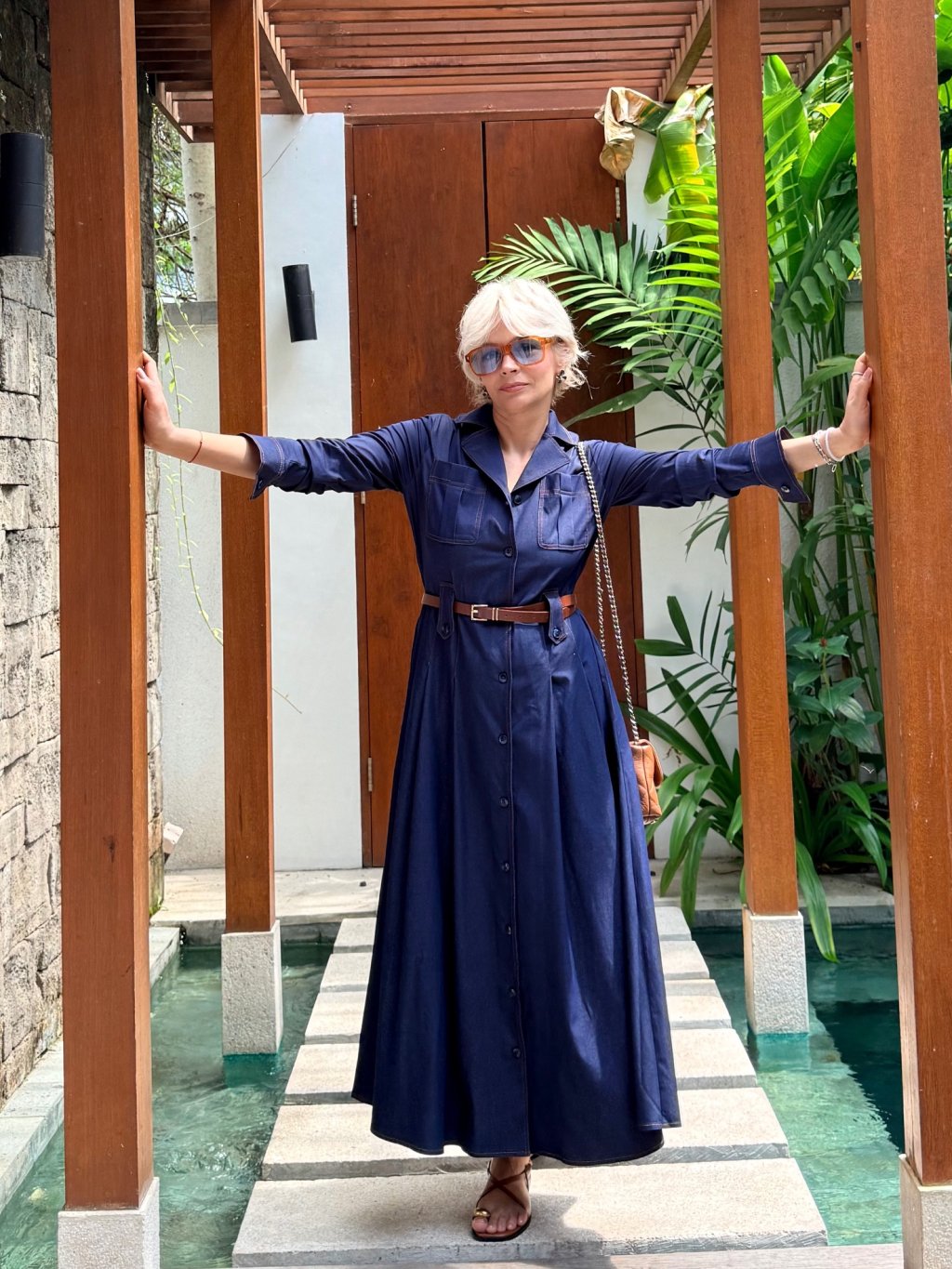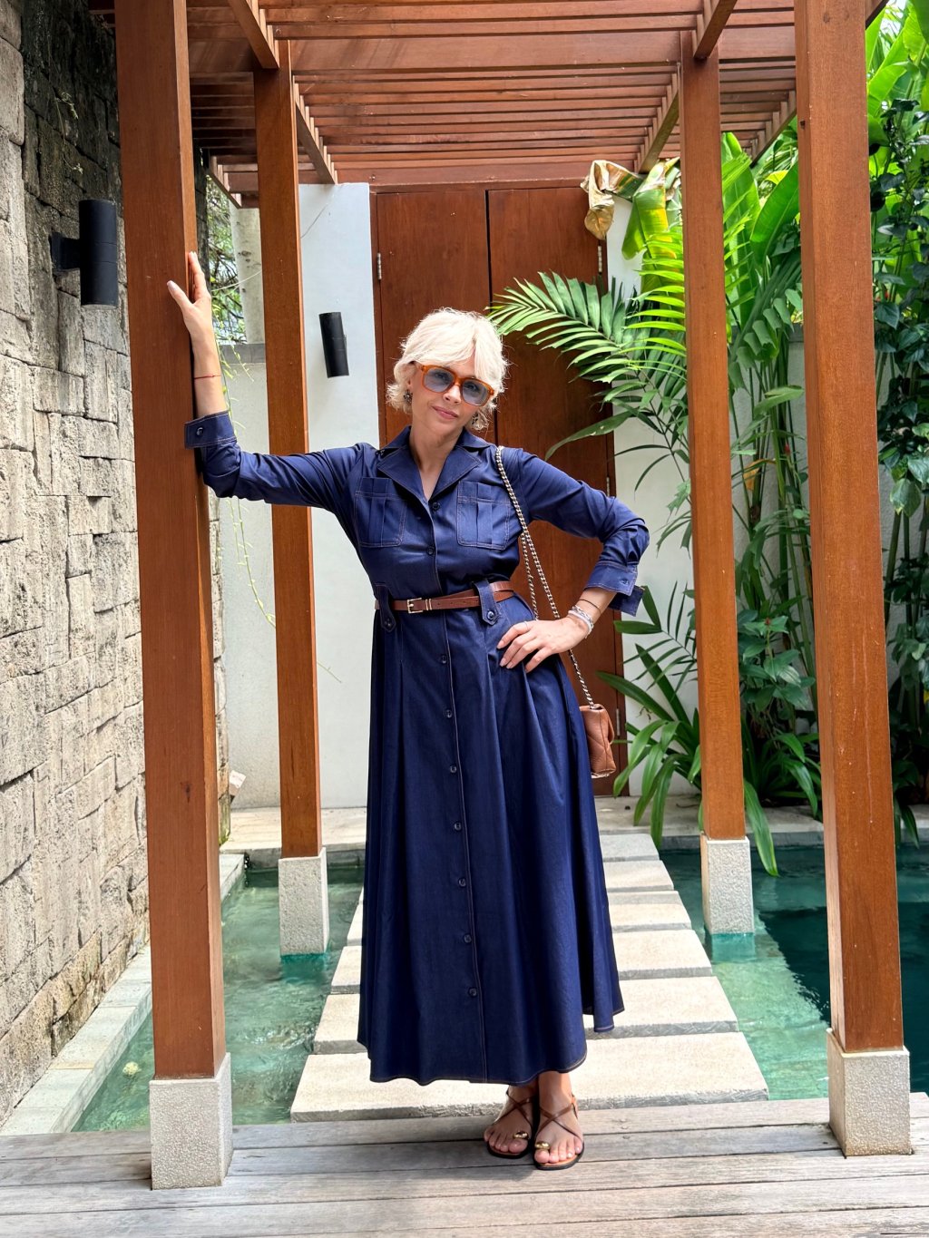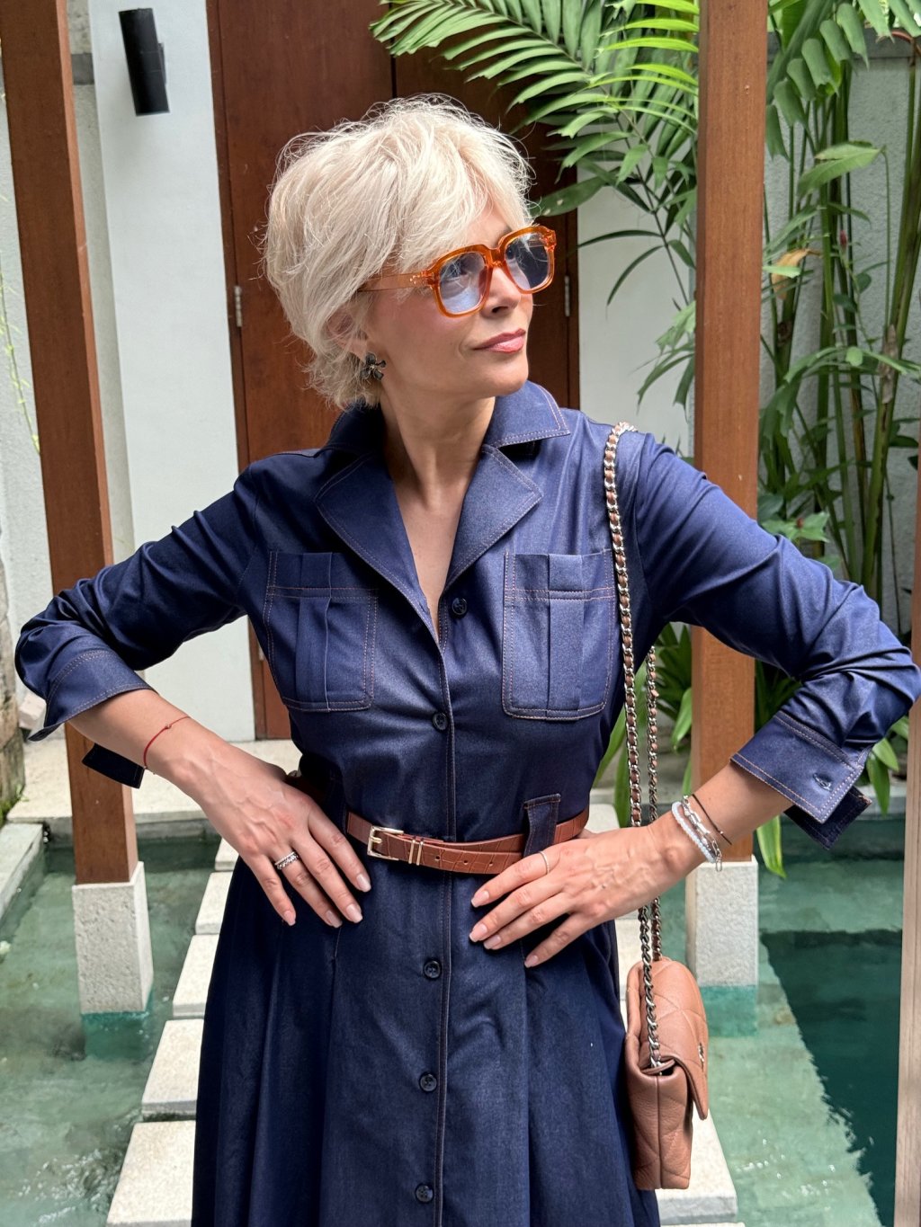 Košilové šaty s gumou vzadu a poutky v pase pro perfektní siluetu a praktickými kapsami. Jsou prošívané hnědou nití, která dodává kontrastní detail.