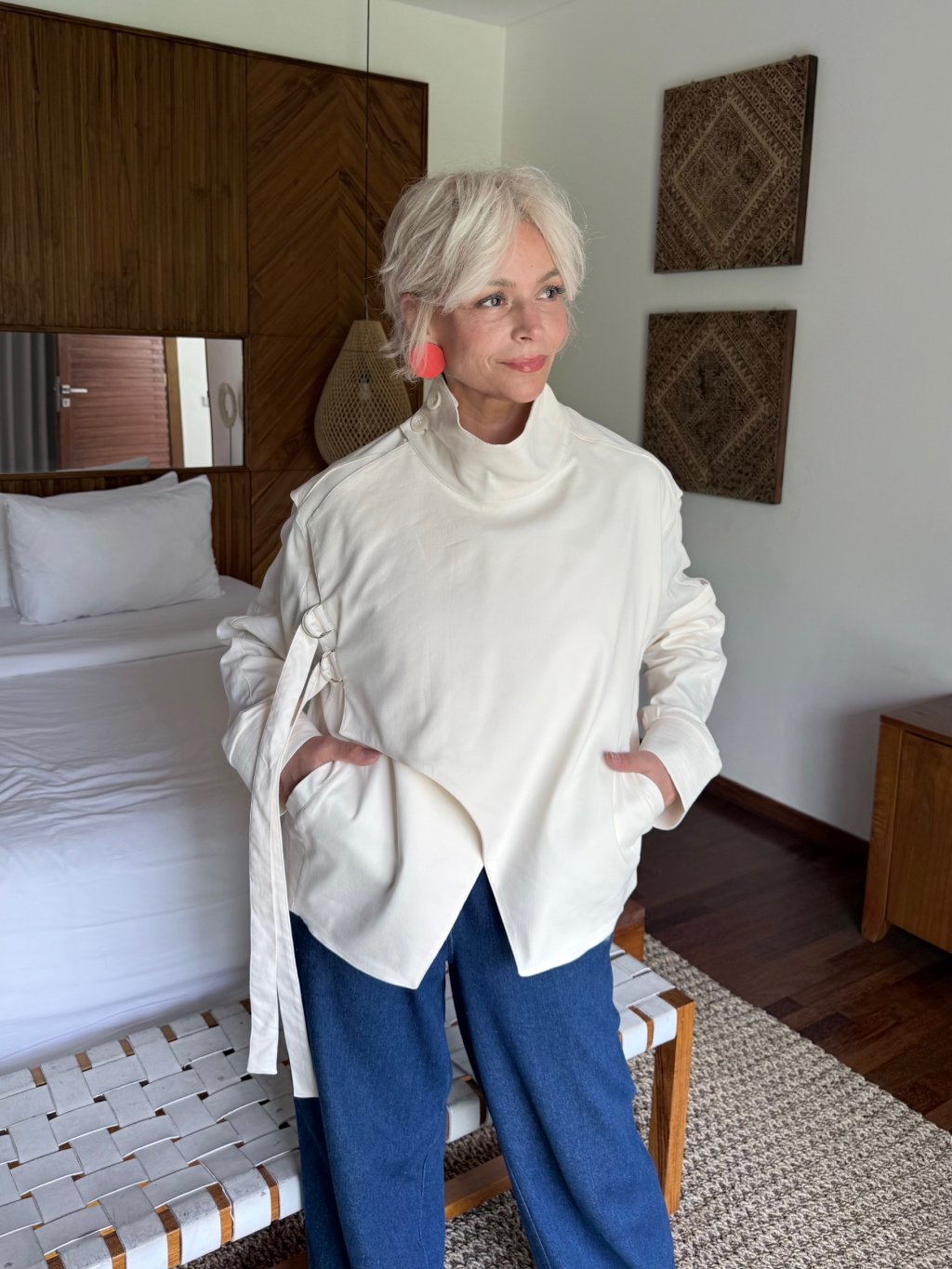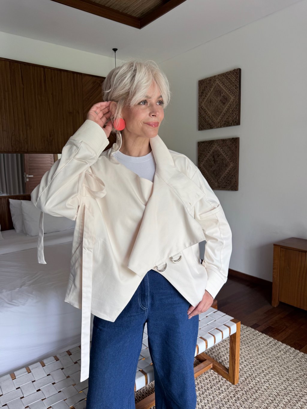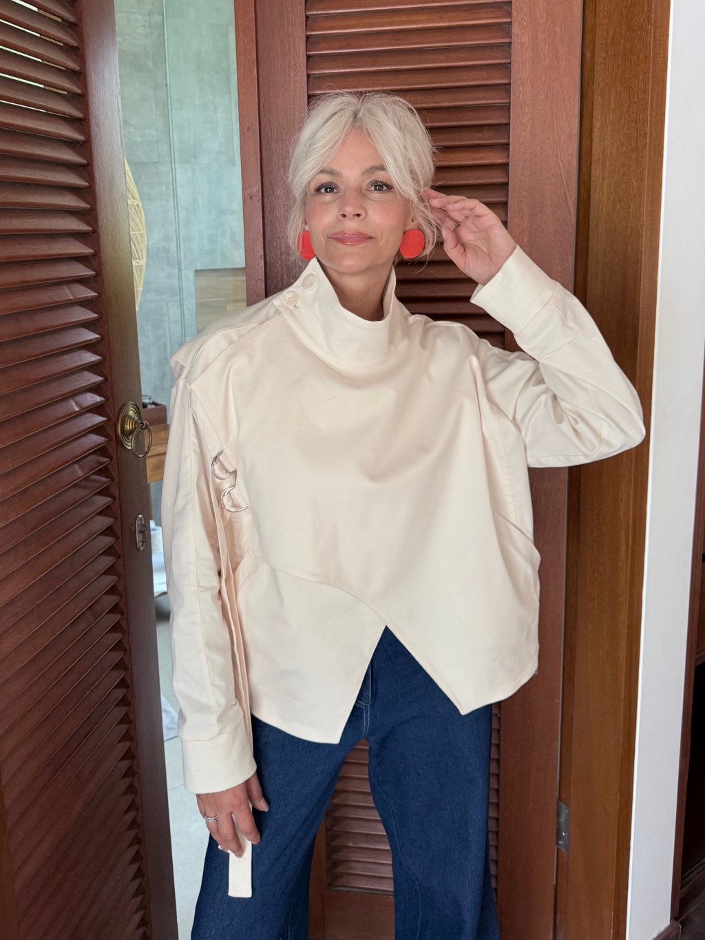 Asymetrický střih a jemné detaily dodávají bundě moderní a nadčasový vzhled. Díky volnějšímu střihu krásně sedí na postavě a umožňuje snadné vrstvení.