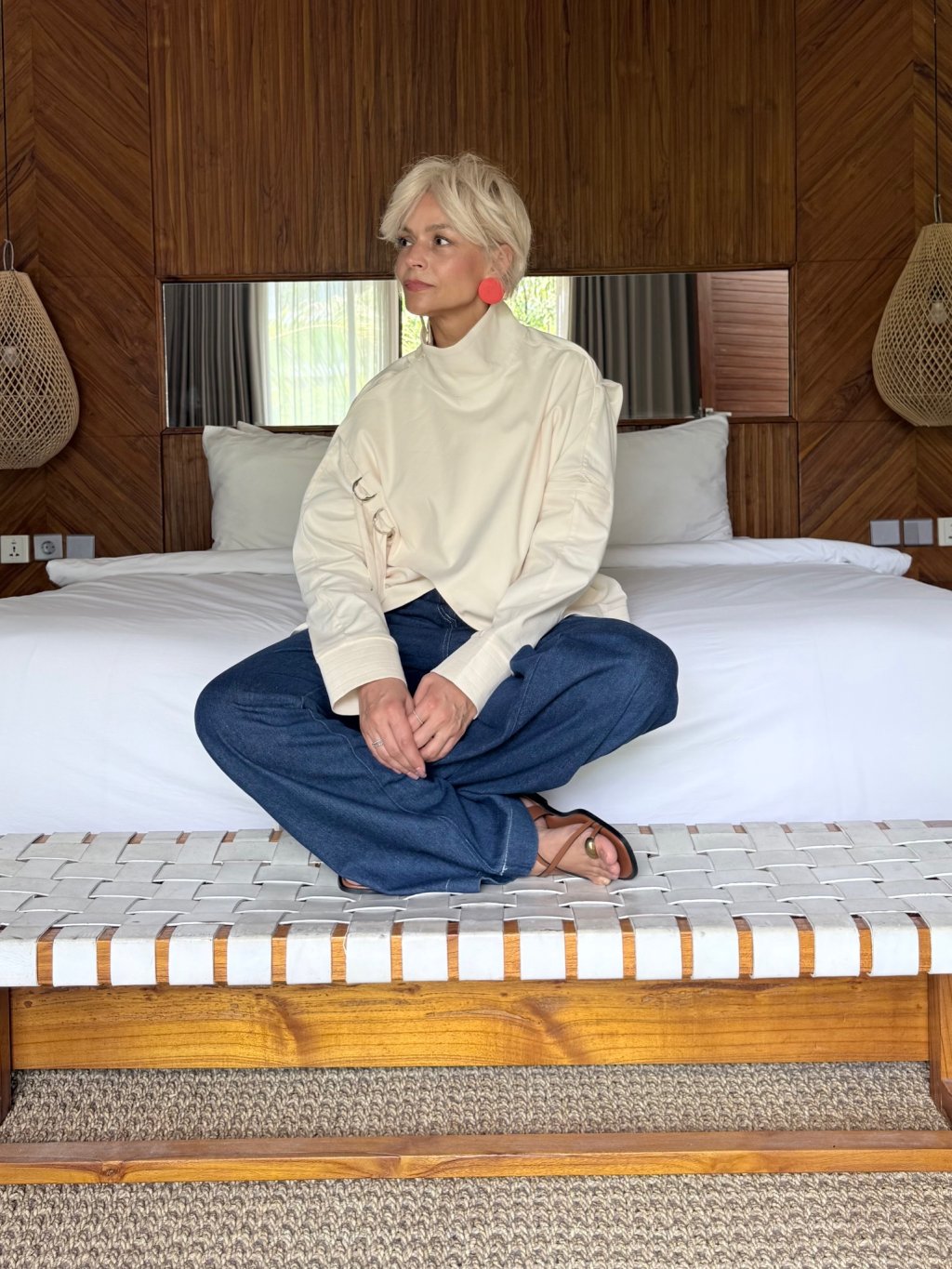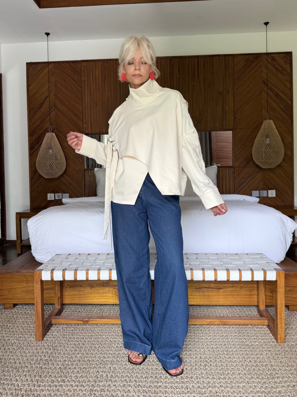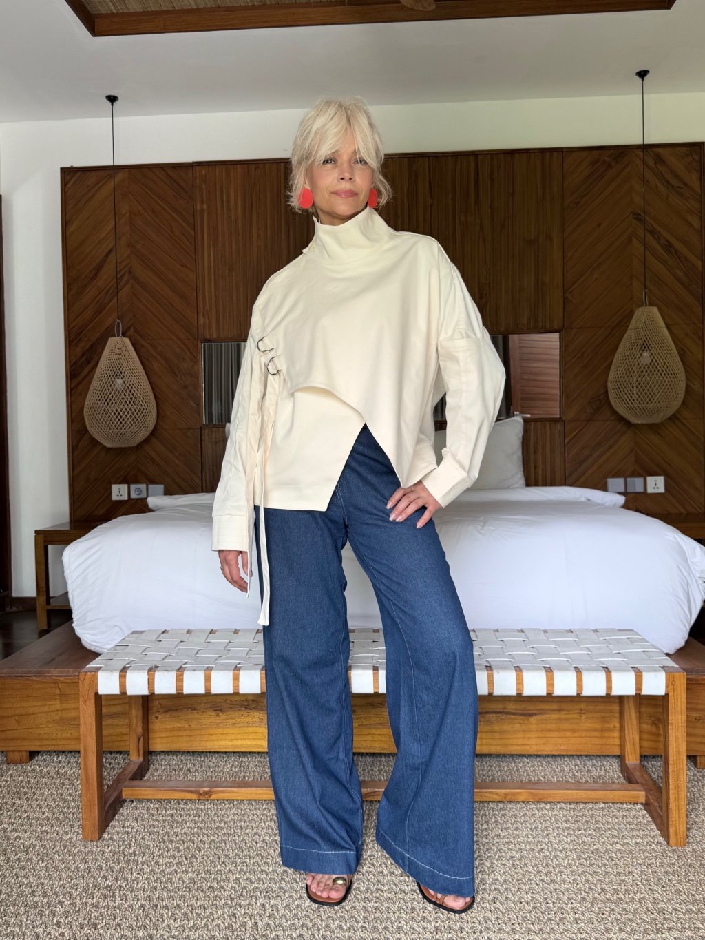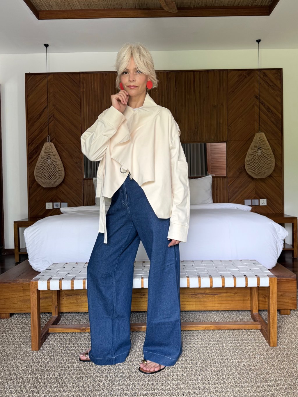 Asymetrický střih a jemné detaily dodávají bundě moderní a nadčasový vzhled. Díky volnějšímu střihu krásně sedí na postavě a umožňuje snadné vrstvení.