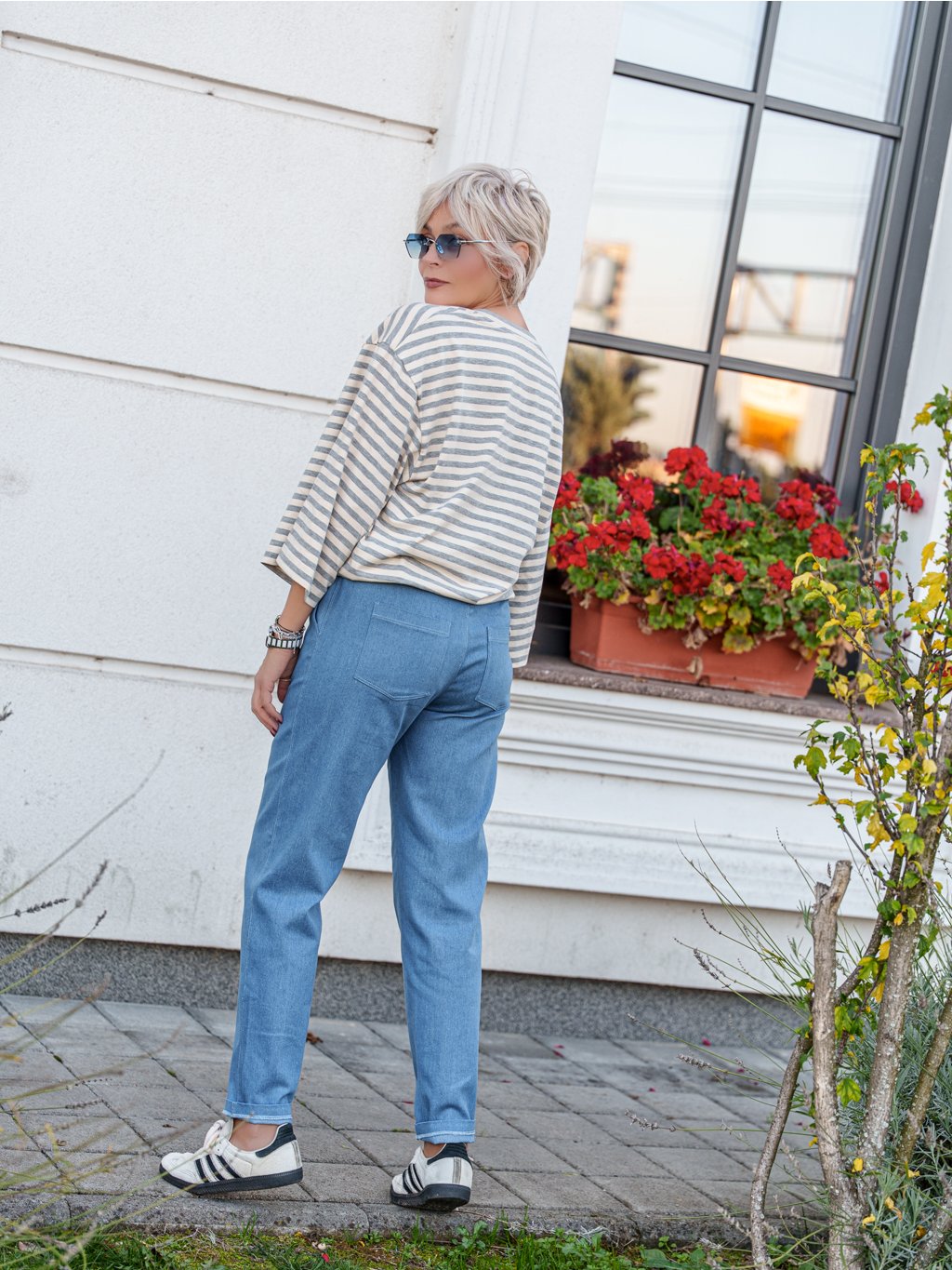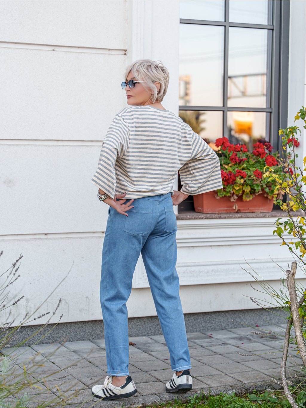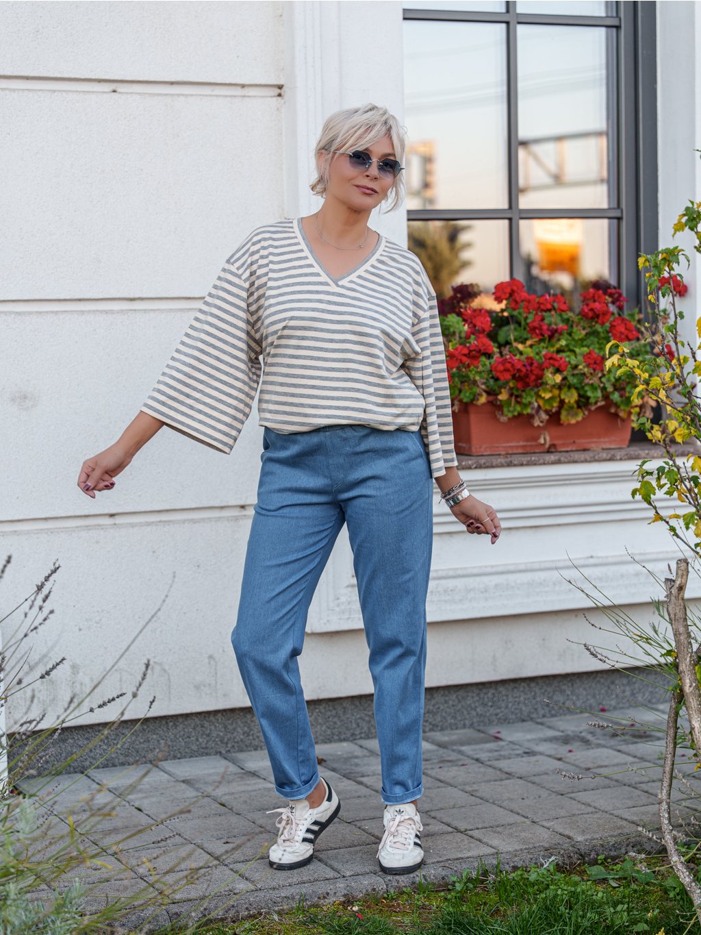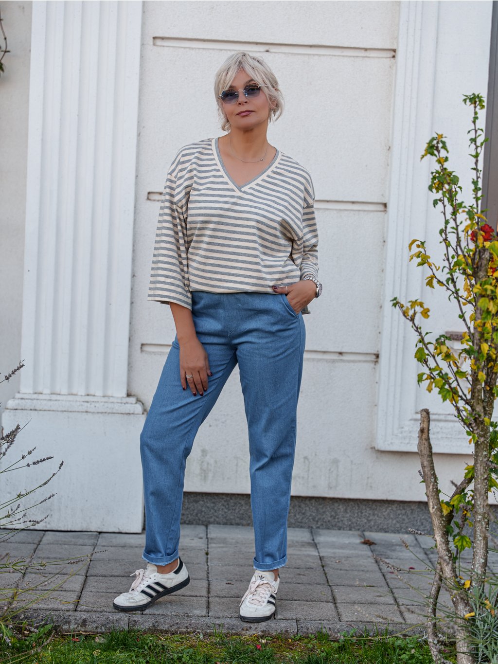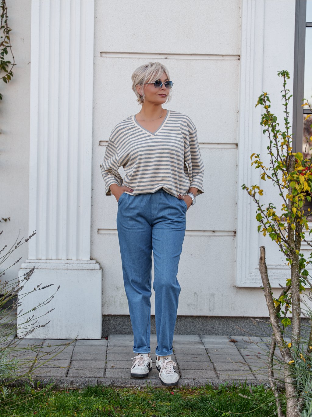 Pruhované tričko do V s volnějším střihem a tříčtvrtečními rukávy. Je vyrobené z příjemného bavlněného úpletu, který je pohodlný a dobře drží tvar. Nadčasový kousek, který snadno zkombinuješ pro ležérní i elegantní outfit.