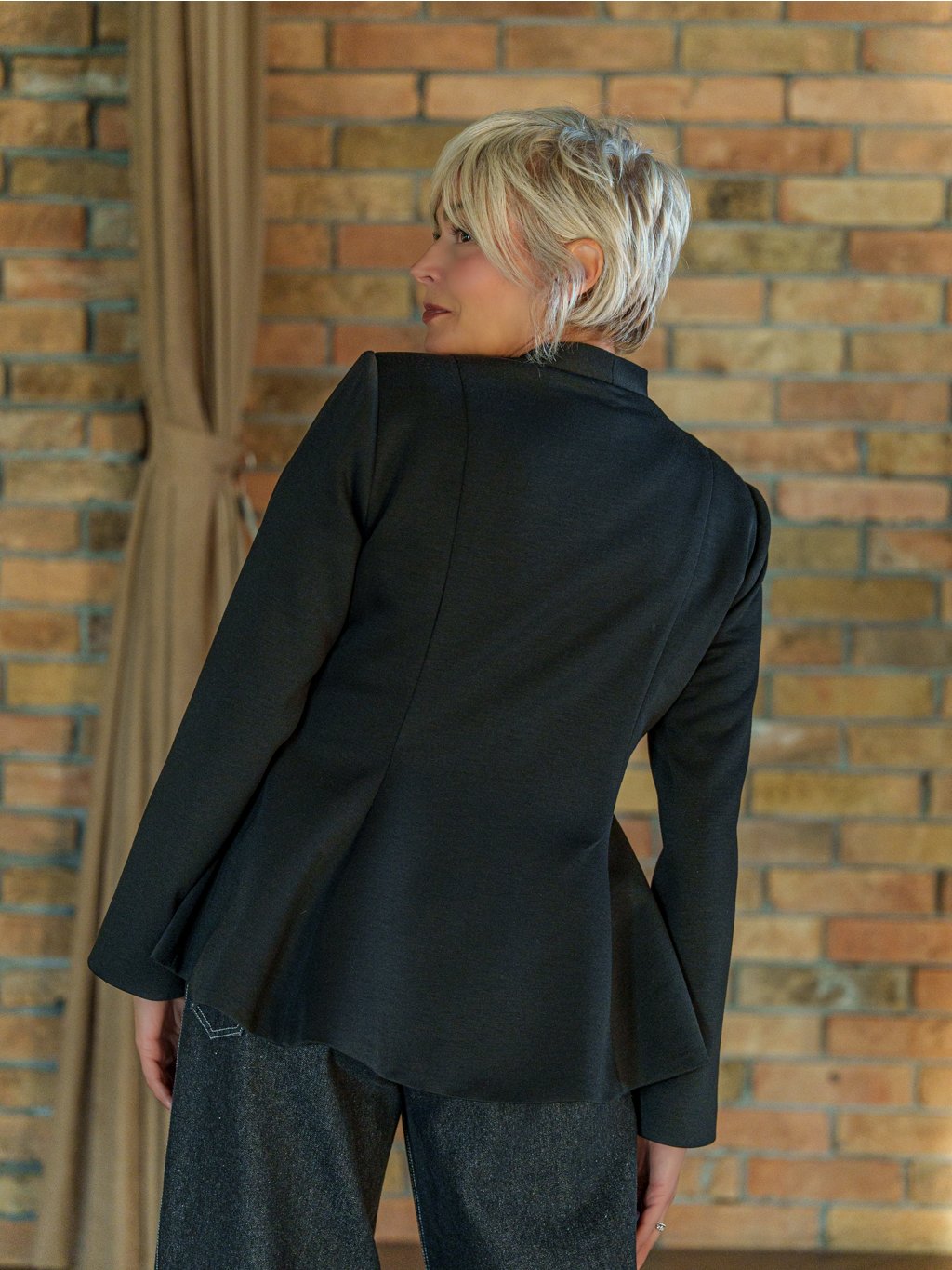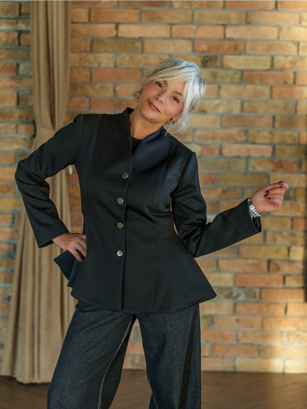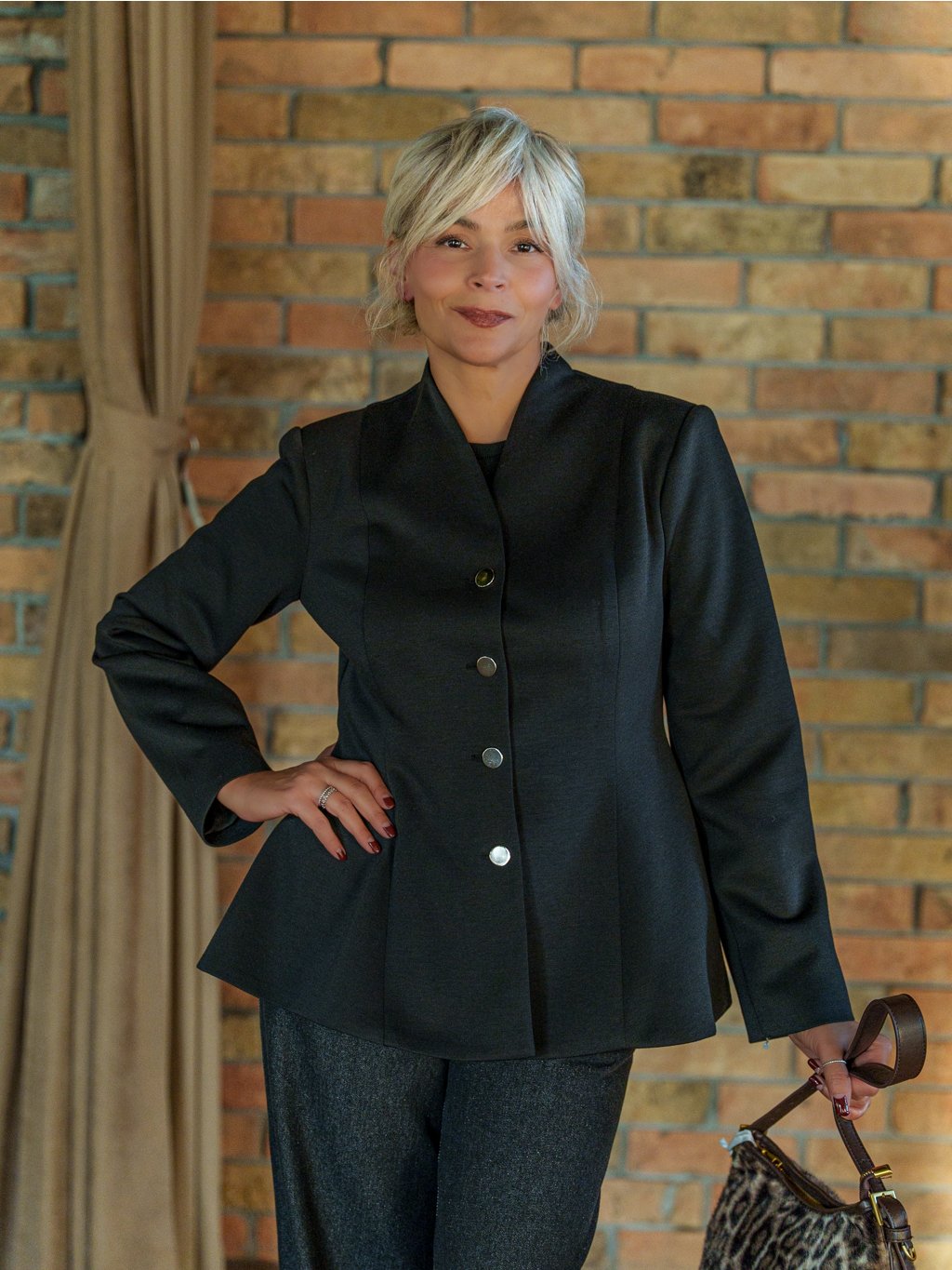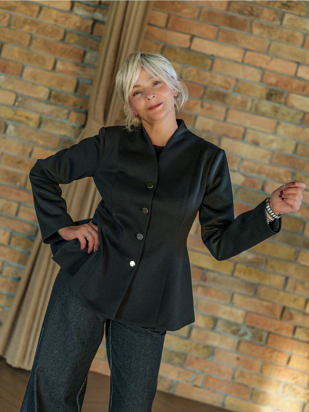 Sako Mimi je elegantní a nadčasový kousek, který krásně zvýrazní ženskou postavu. Má precizní střih, jemně rozšířený spodní lem a zapínání na stříbrný knoflíky. Je celé podšívkované, což zajišťuje pohodlí a perfektní padnutí. Skvěle se hodí jak k formálním outfitům, tak i k ležérním kombinacím s džínami.