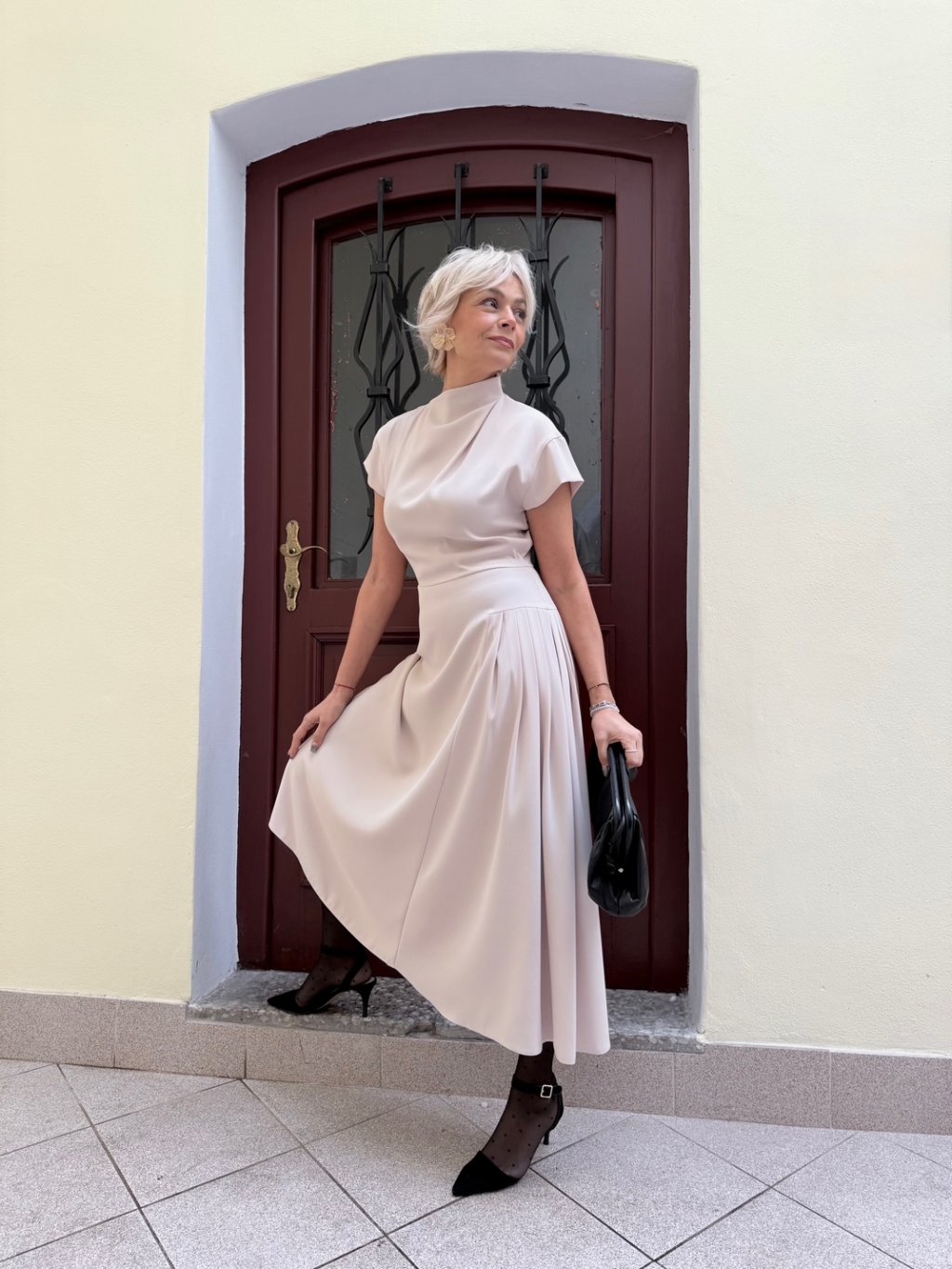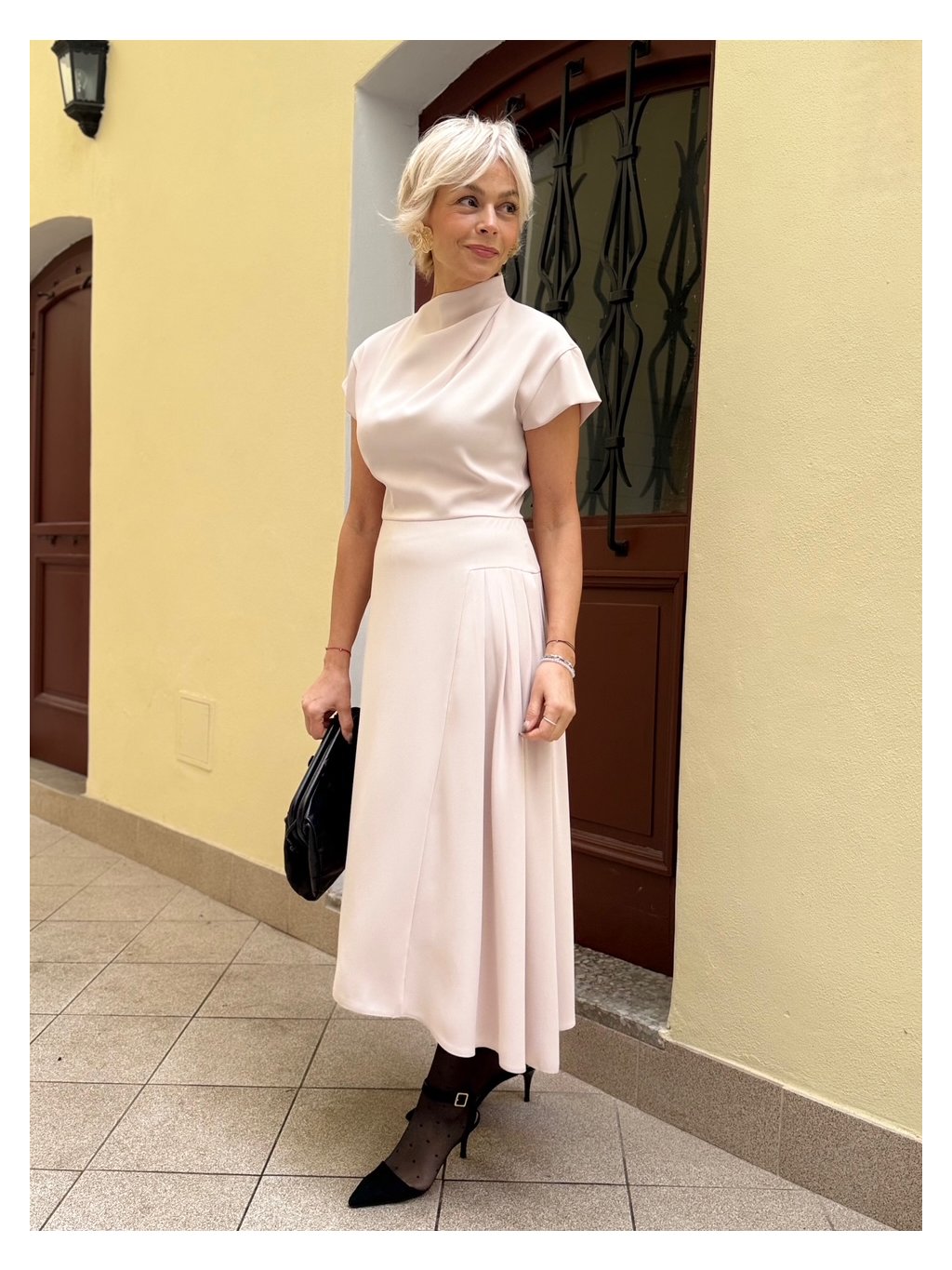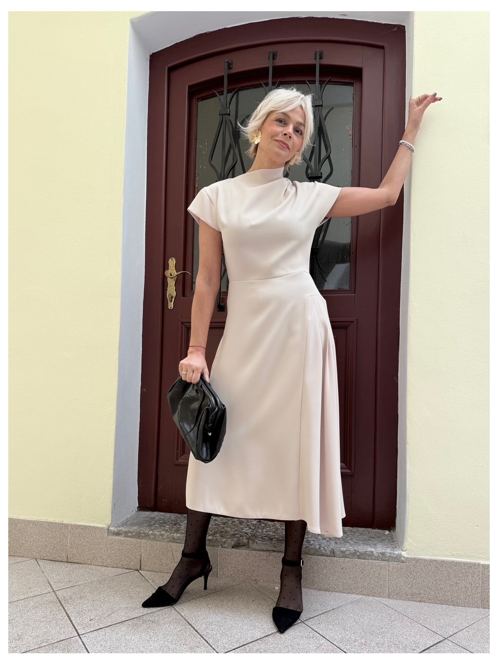 Autorský, zcela nový asymetrický střih s jemným plisováním na jedné straně pracuje s pohybem i ženskou siluetou. Čistá linie bez kapes, skrytý zip vzadu a promyšlený detail v každém kroku.
