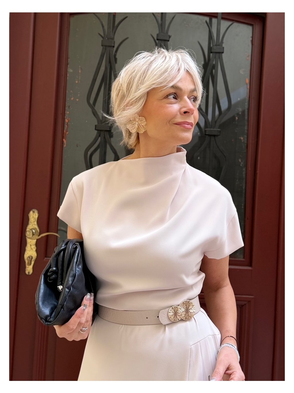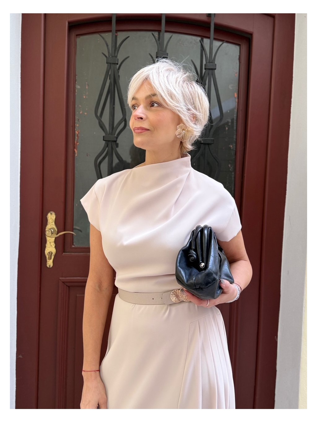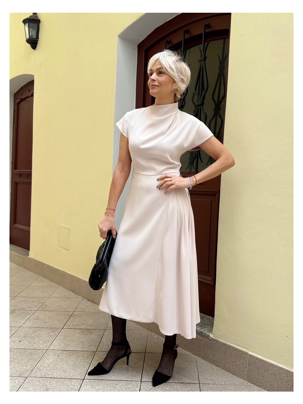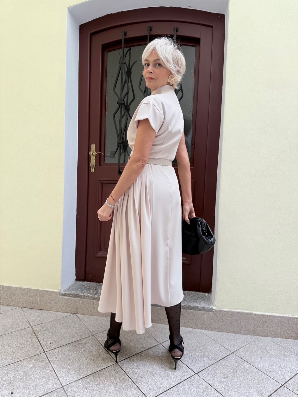 Autorský, zcela nový asymetrický střih s jemným plisováním na jedné straně pracuje s pohybem i ženskou siluetou. Čistá linie bez kapes, skrytý zip vzadu a promyšlený detail v každém kroku.