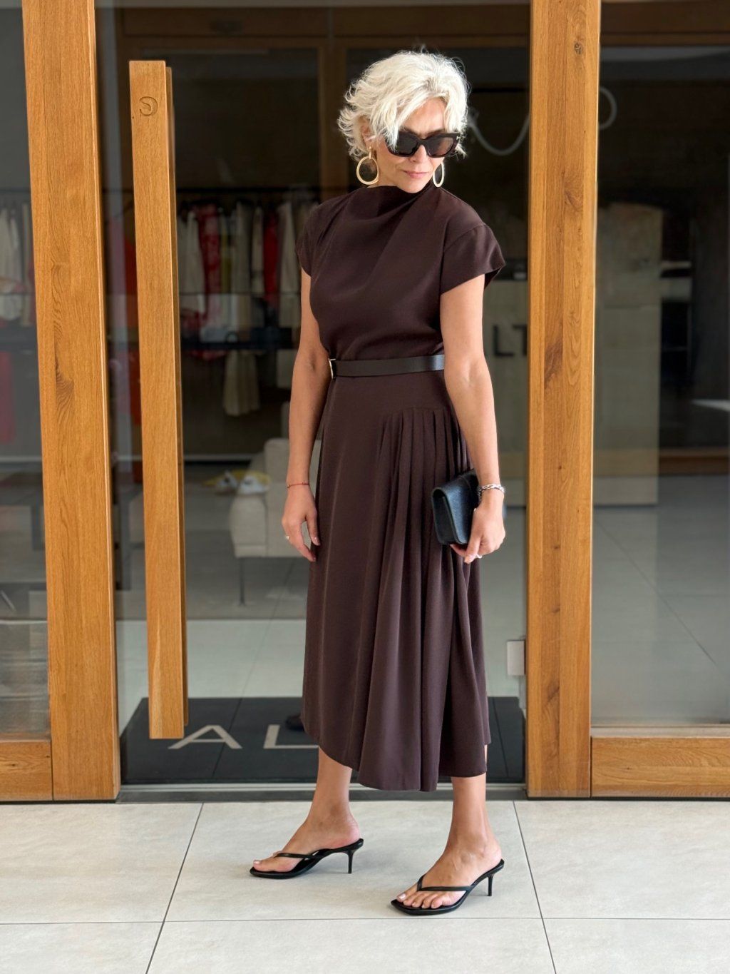 Autorský, zcela nový asymetrický střih s jemným plisováním na jedné straně pracuje s pohybem i ženskou siluetou. Čistá linie bez kapes, skrytý zip vzadu a promyšlený detail v každém kroku.
