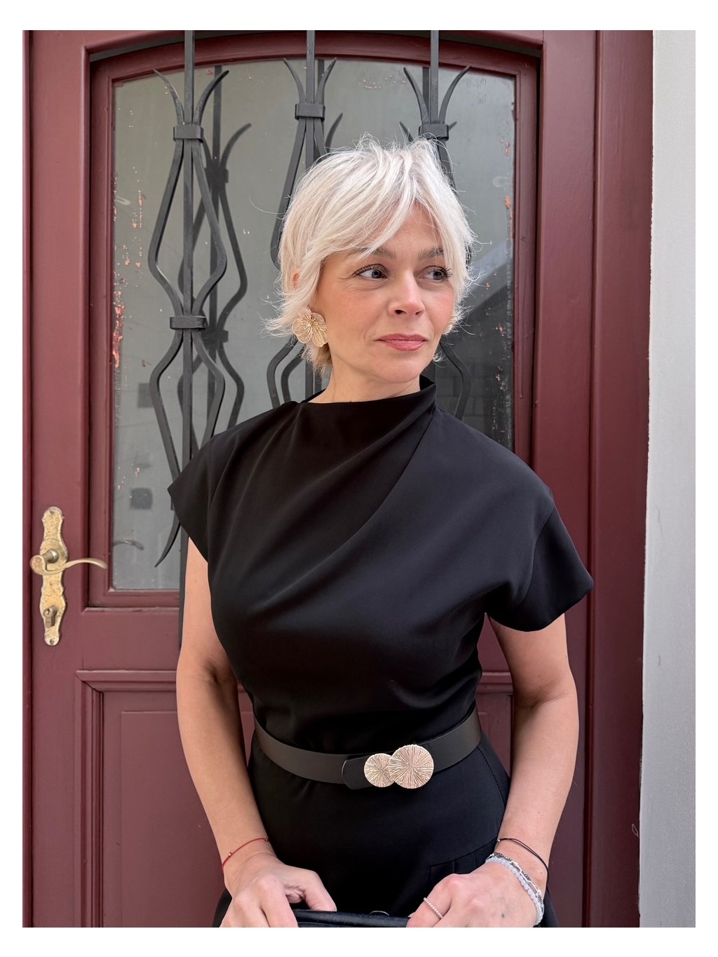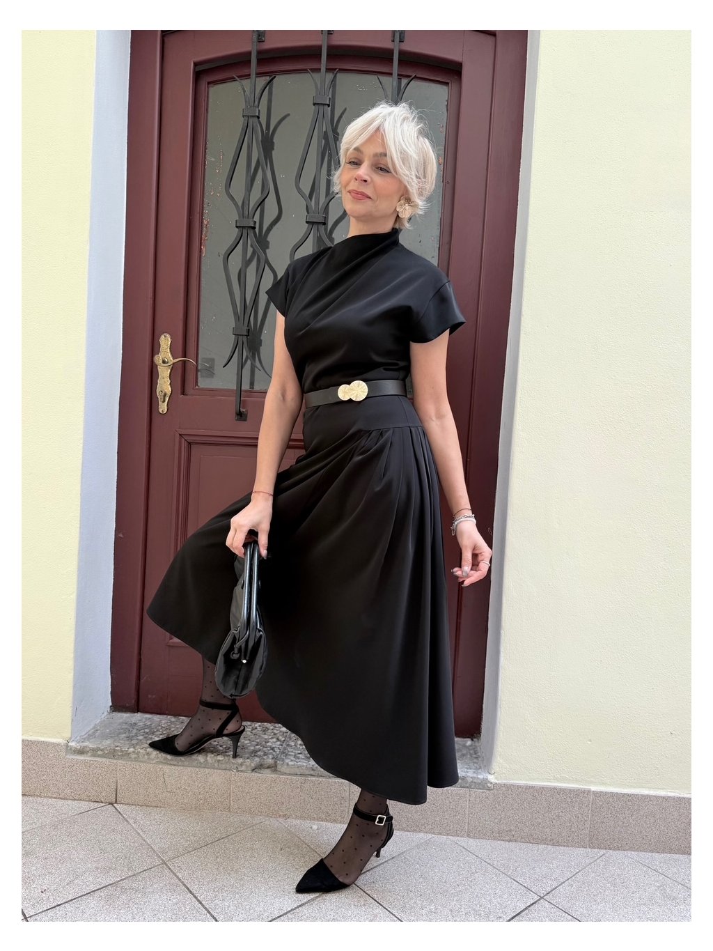 Autorský, zcela nový asymetrický střih s jemným plisováním na jedné straně pracuje s pohybem i ženskou siluetou. Čistá linie bez kapes, skrytý zip vzadu a promyšlený detail v každém kroku.