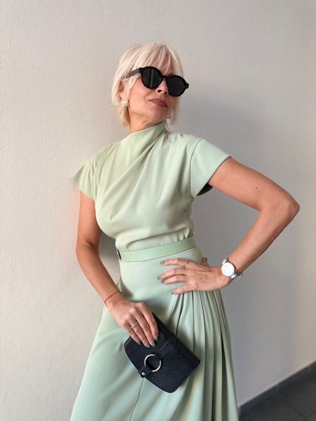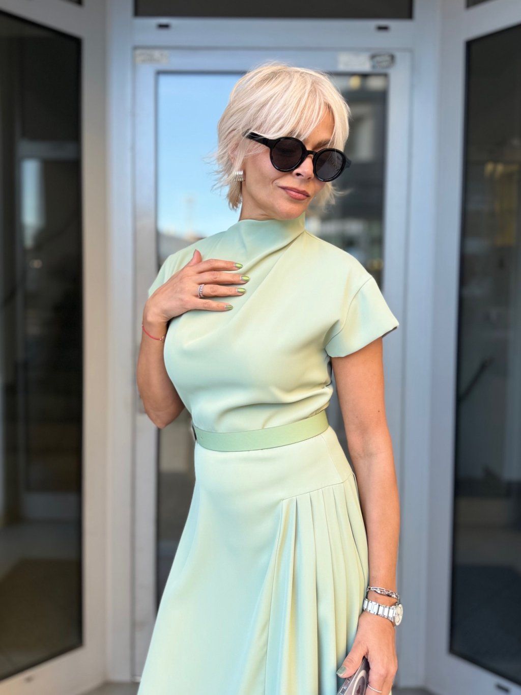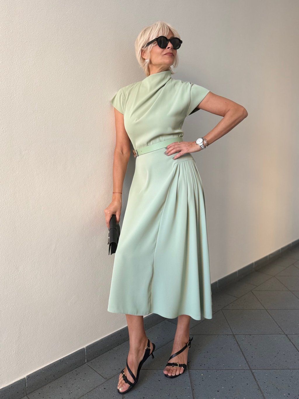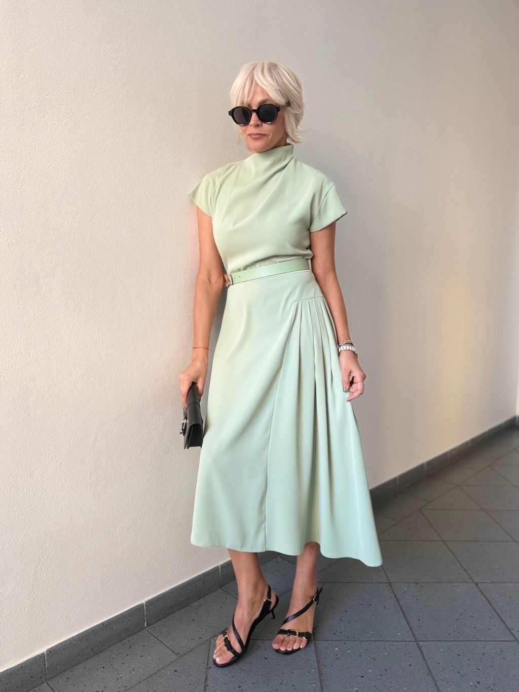 Autorský, zcela nový asymetrický střih s jemným plisováním na jedné straně pracuje s pohybem i ženskou siluetou. Čistá linie bez kapes, skrytý zip vzadu a promyšlený detail v každém kroku.