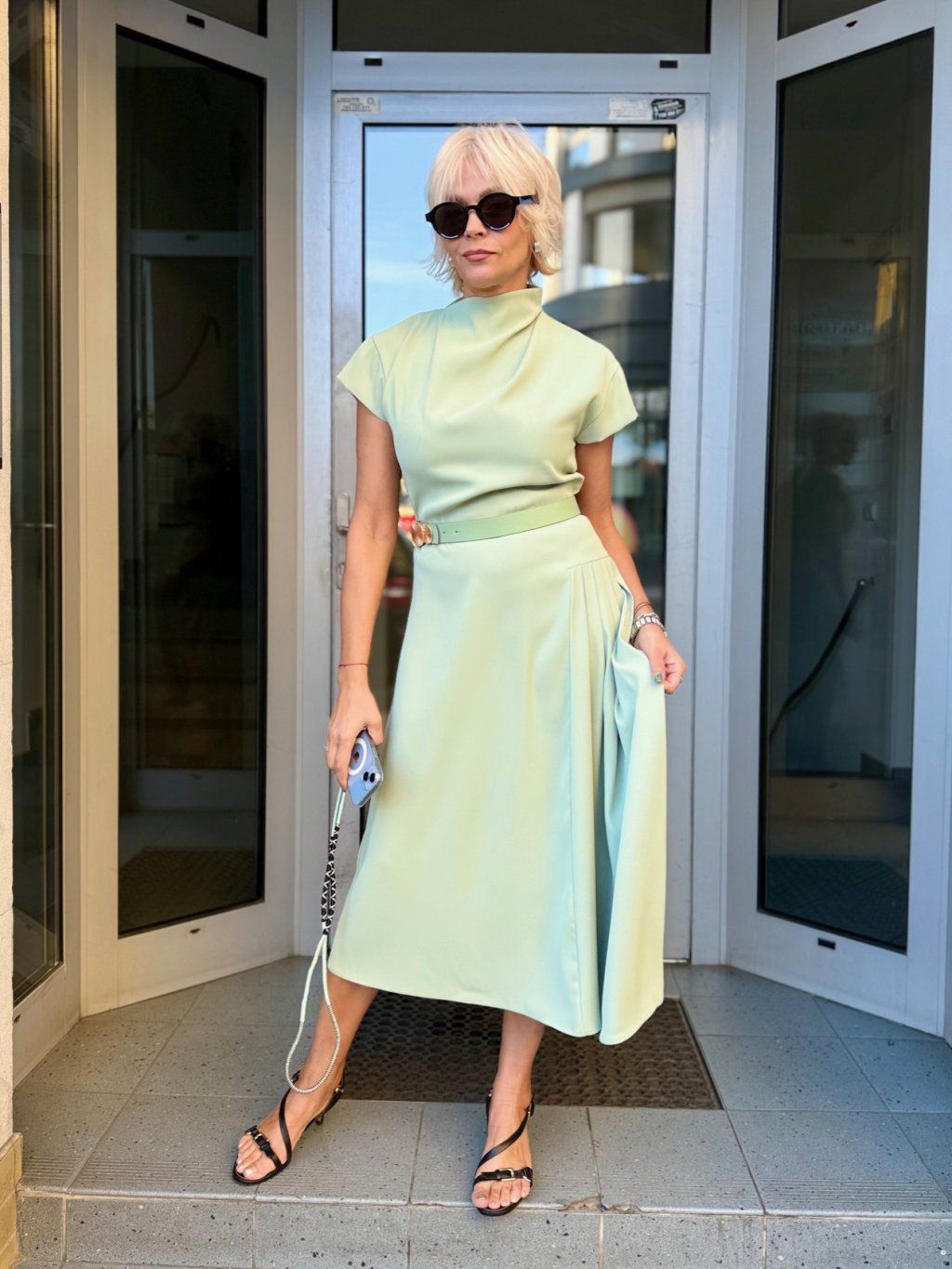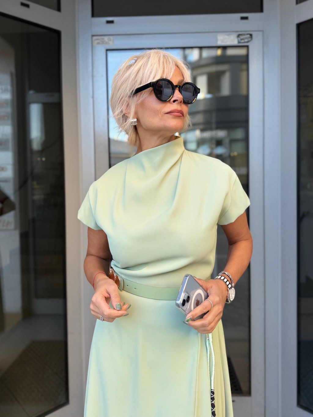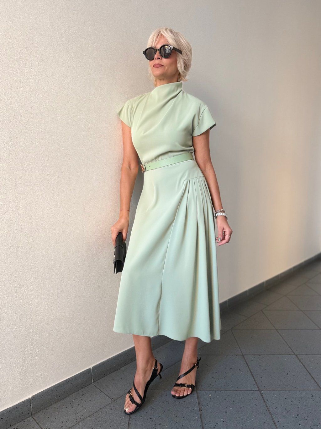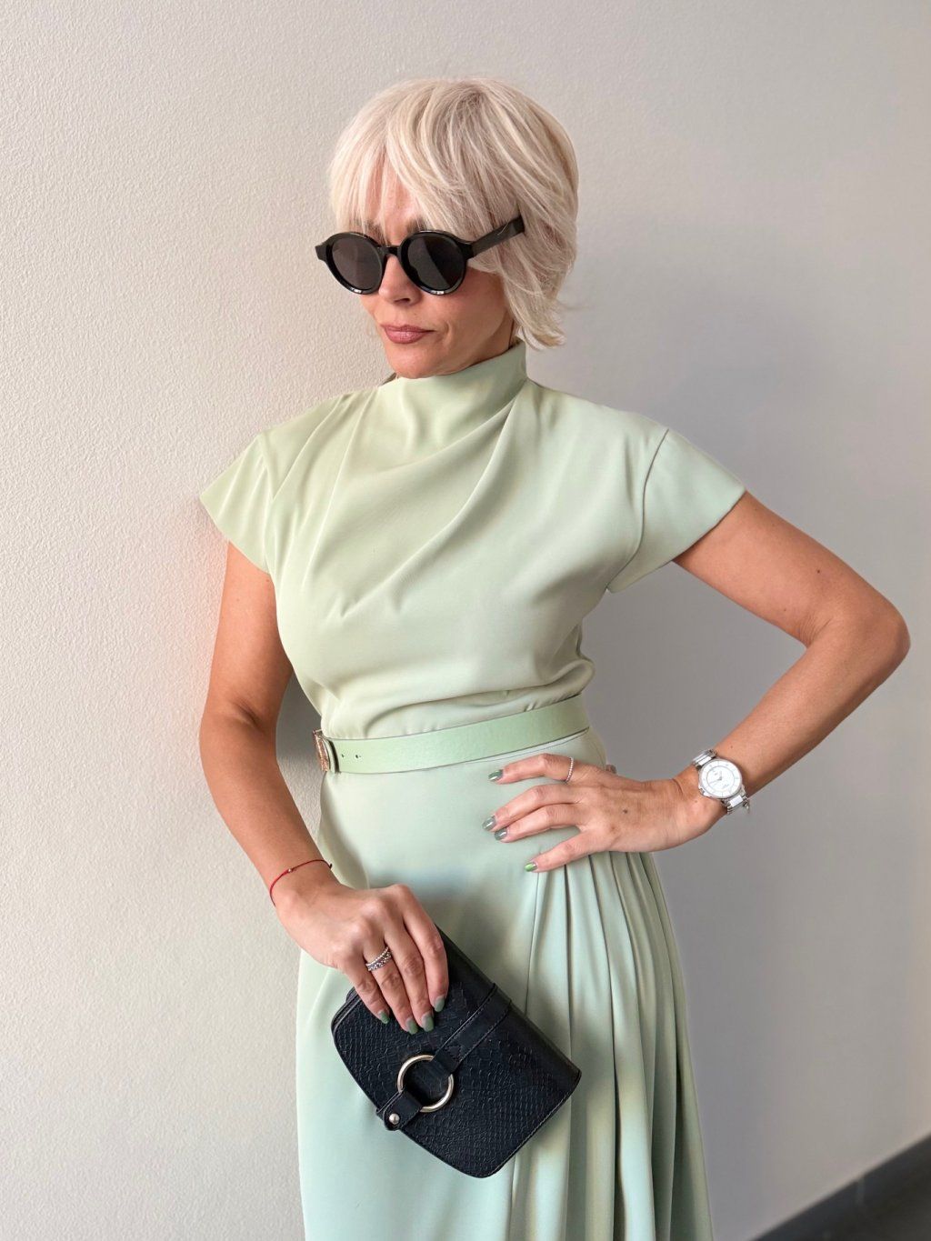 Autorský, zcela nový asymetrický střih s jemným plisováním na jedné straně pracuje s pohybem i ženskou siluetou. Čistá linie bez kapes, skrytý zip vzadu a promyšlený detail v každém kroku.