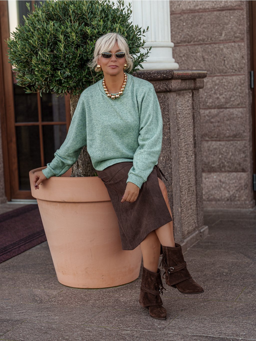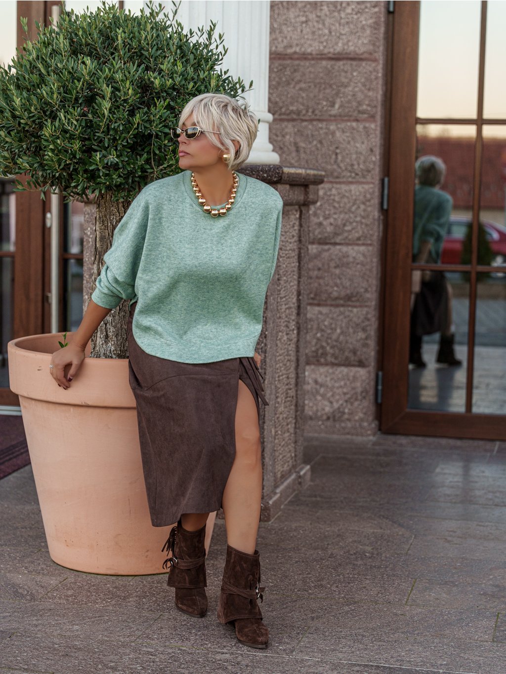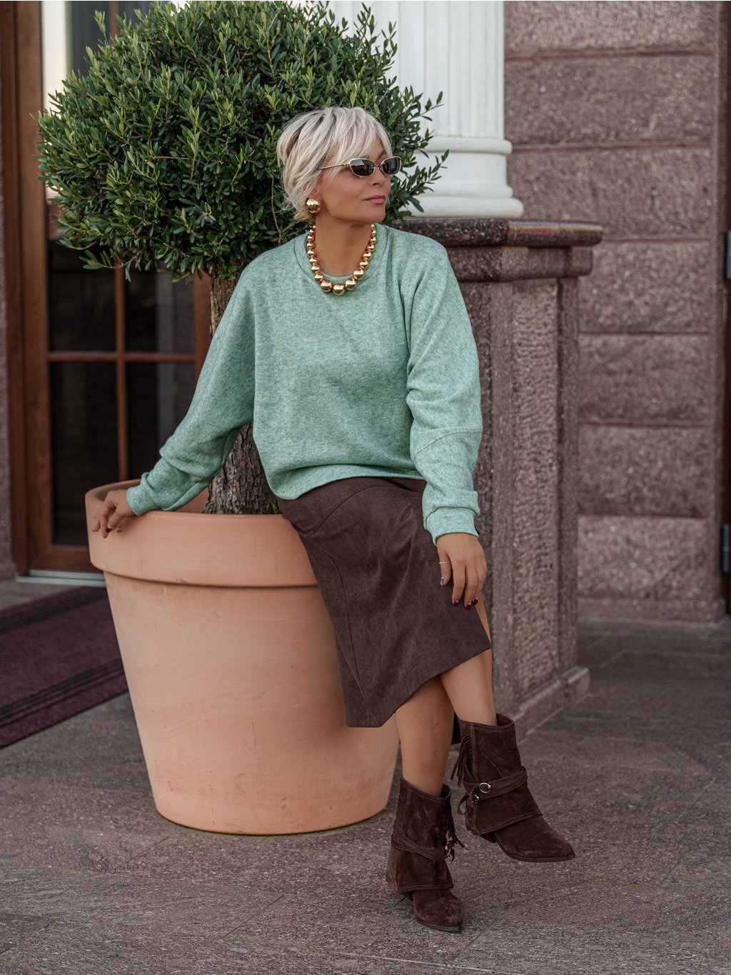 Pro dokonalý outfit ji můžeš sladit s kabátkem ze stejného materiálu – vytvoříš tak harmonický a sofistikovaný celek vhodný pro jakoukoliv příležitost.