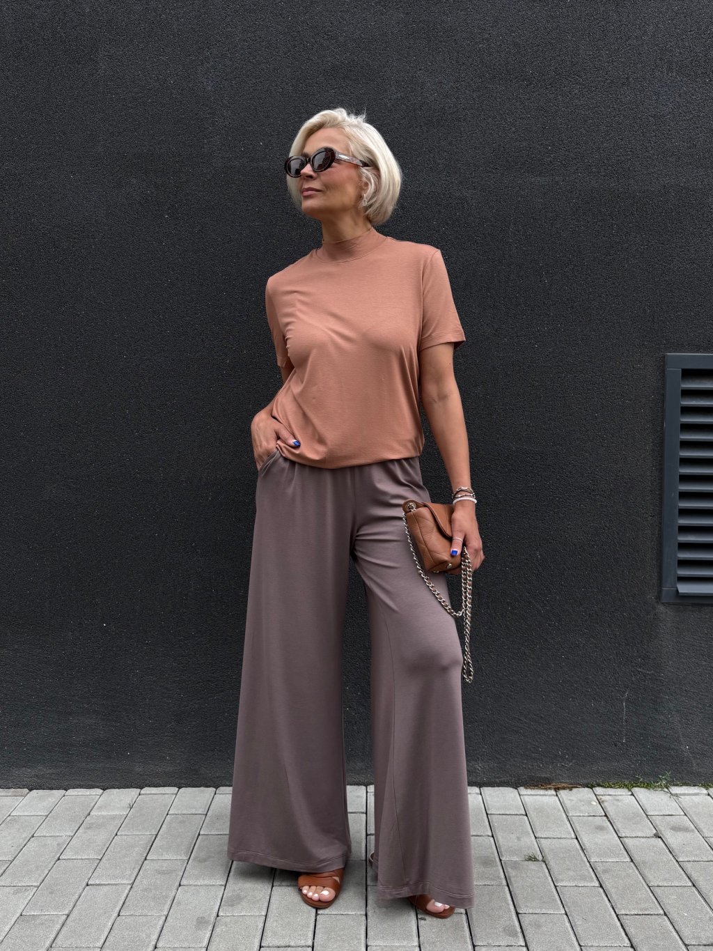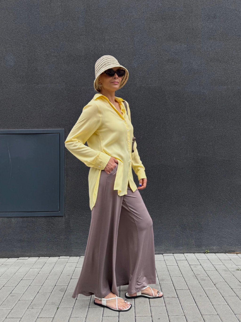 Volné, jemné kalhoty z kvalitní a vzdušné viskózy by neměly chybět v šatníku žádné ženy. Ať už jste elegantní či volnočasový typ. Tyto kalhoty využijete na každou příležitost i díky pohodlné gumě v pase. A jak je naším zvykem, nechybí ani kapsy. Kalhoty jsme pro Vás ušili v příjemné midi délce.